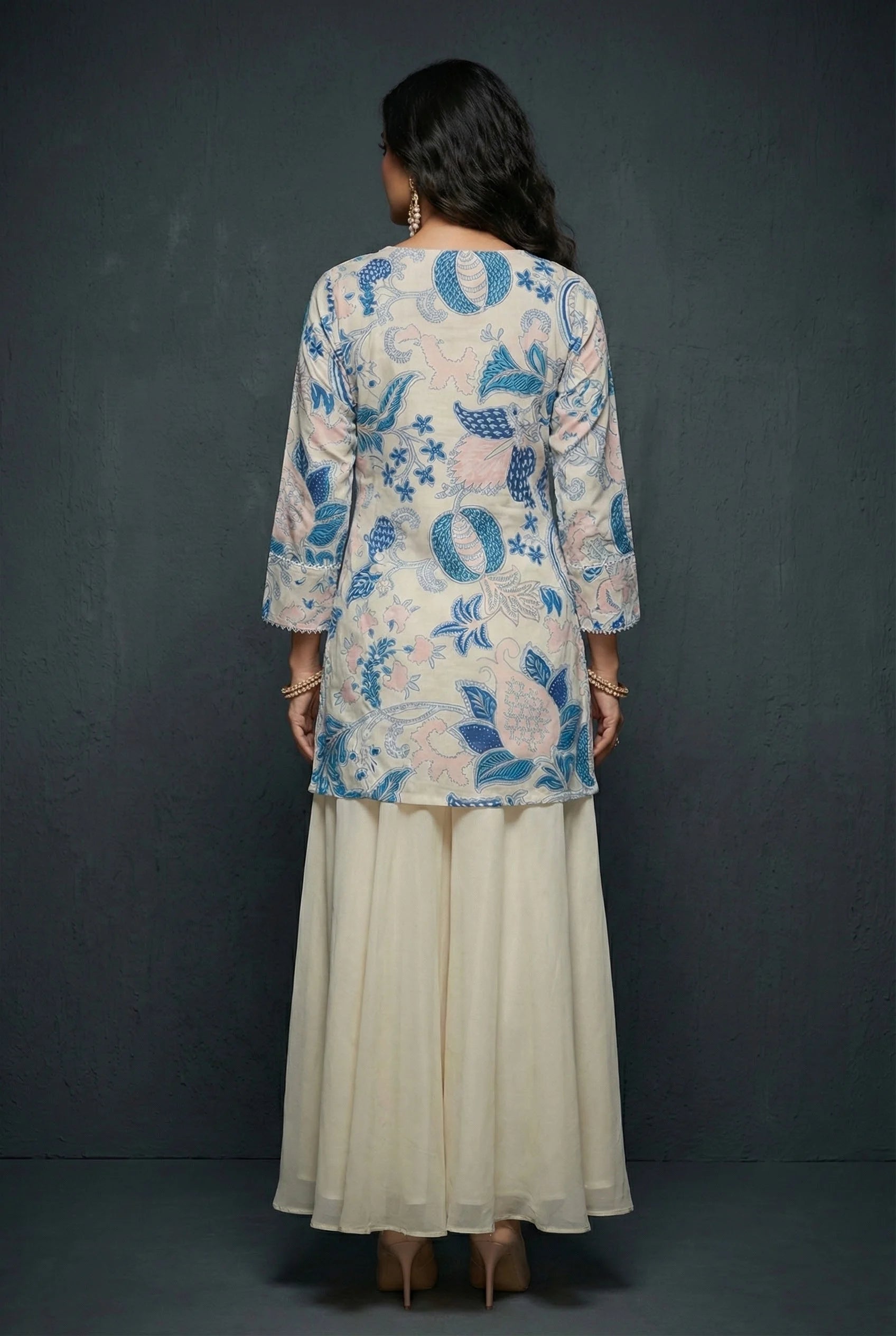 Designed with ¾ sleeves and a round neck highlighted with delicate lace. Crafted in soft cotton blend fabric for comfort and graceful drape. The hip-length kurti pairs seamlessly with georgette flared pants.