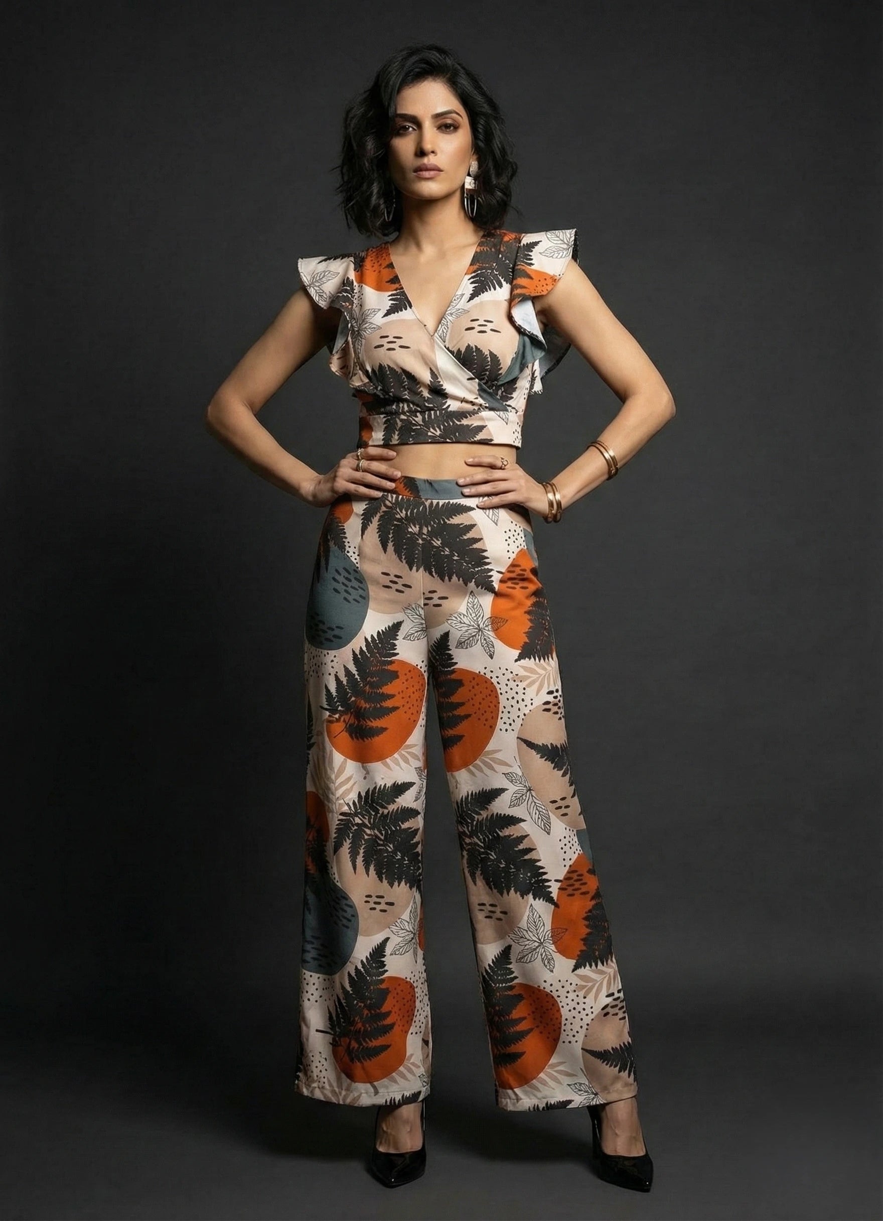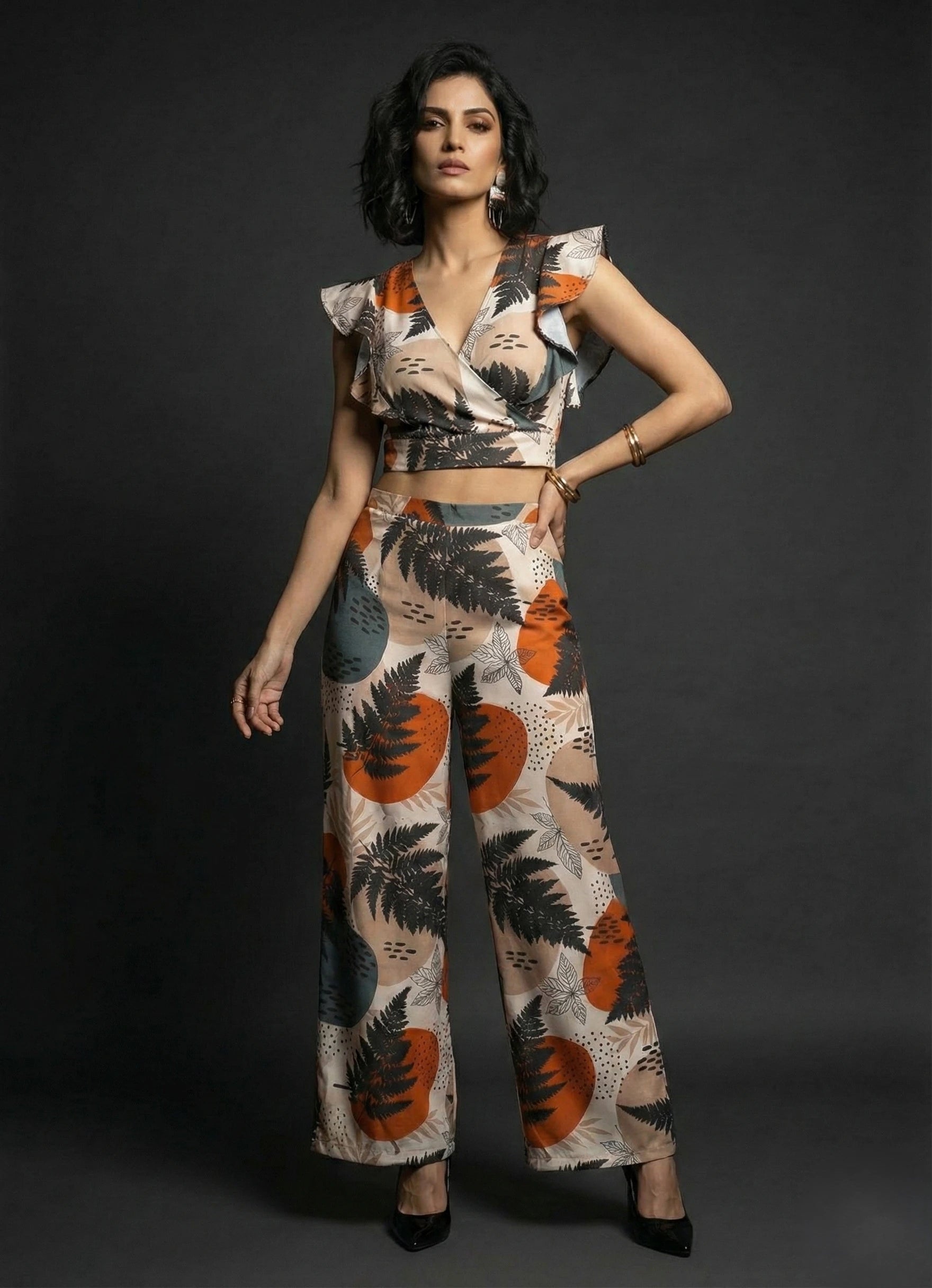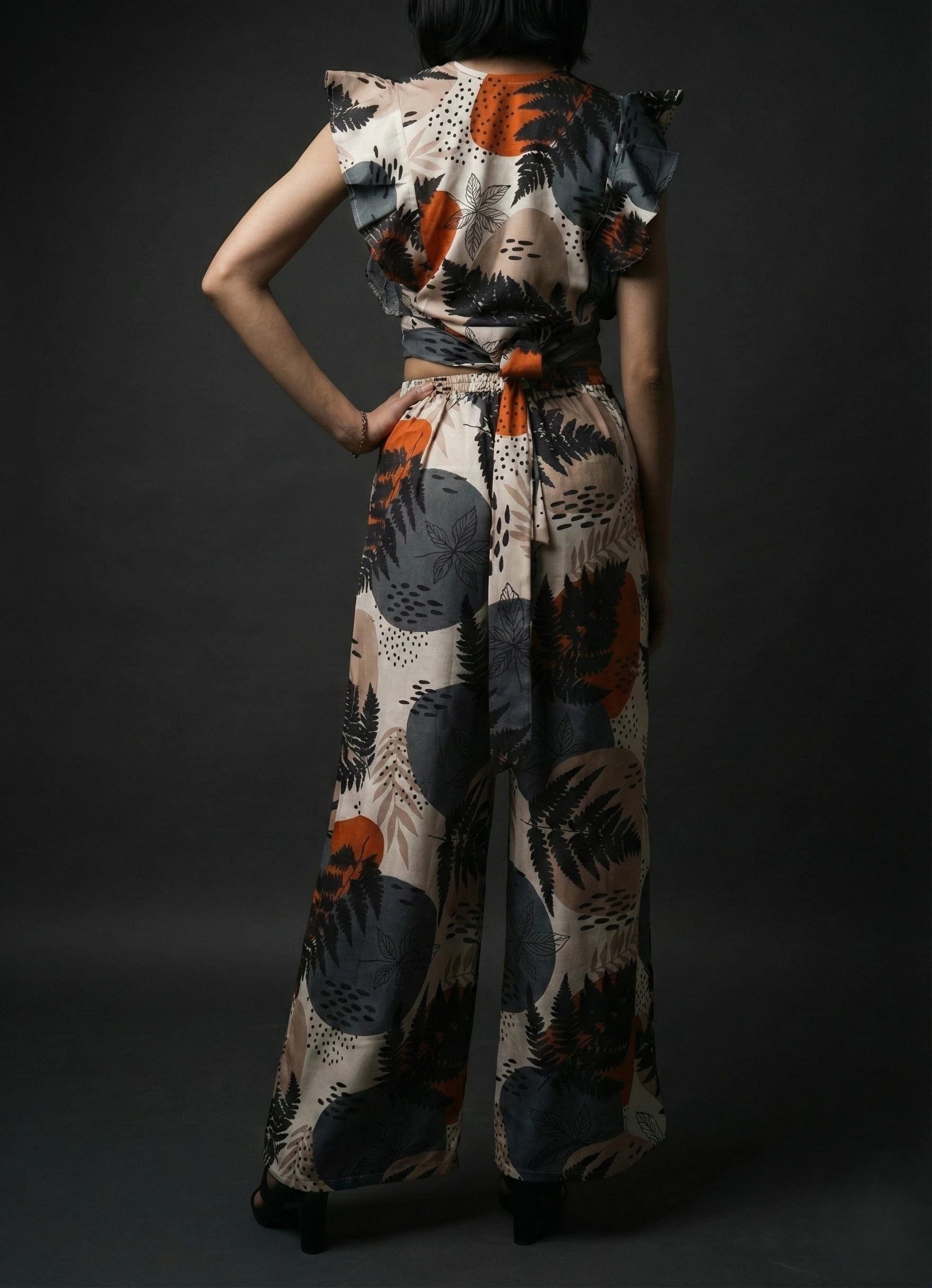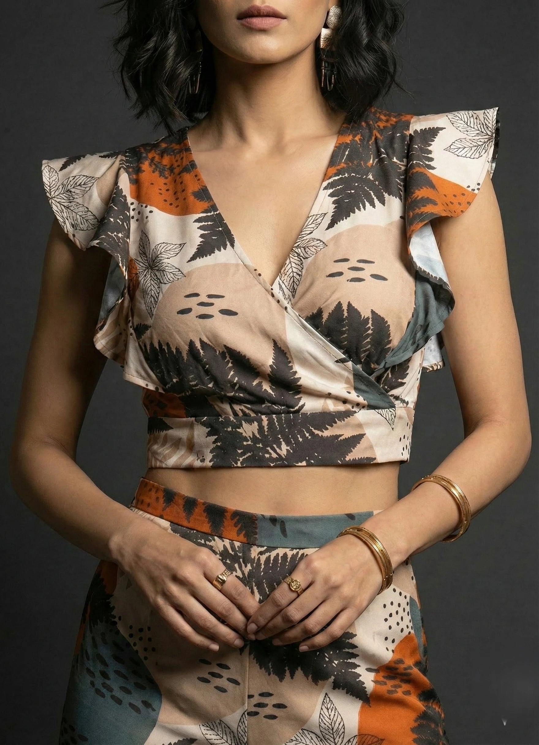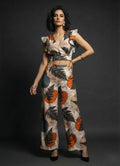 Elevate your style with this stunning ivory crop top and pant set! The sleeveless top features a flattering V-neck, delicate ruffle details, and a beautiful leaf print that adds a touch of elegance. The matching pant has a comfortable full-length design with a half belt and half elastic closure, providing a flattering fit.