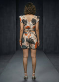 The sleeveless top features a flattering V-neck, delicate ruffle details, and a beautiful leaf print that adds a touch of whimsy. The matching pant has a stylish above-the-knee length design with a half belt and half elastic closure, providing a comfortable and flattering fit.