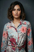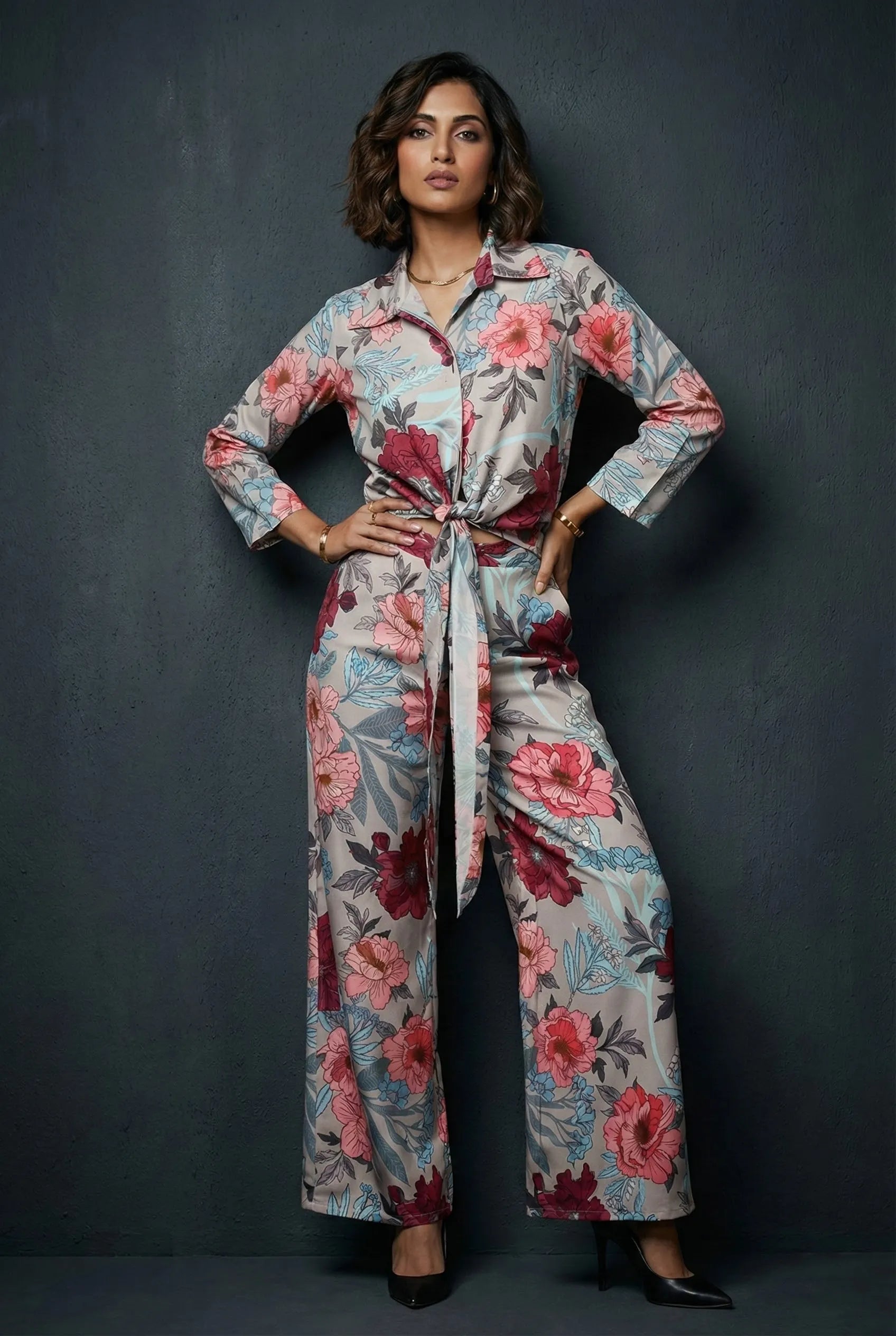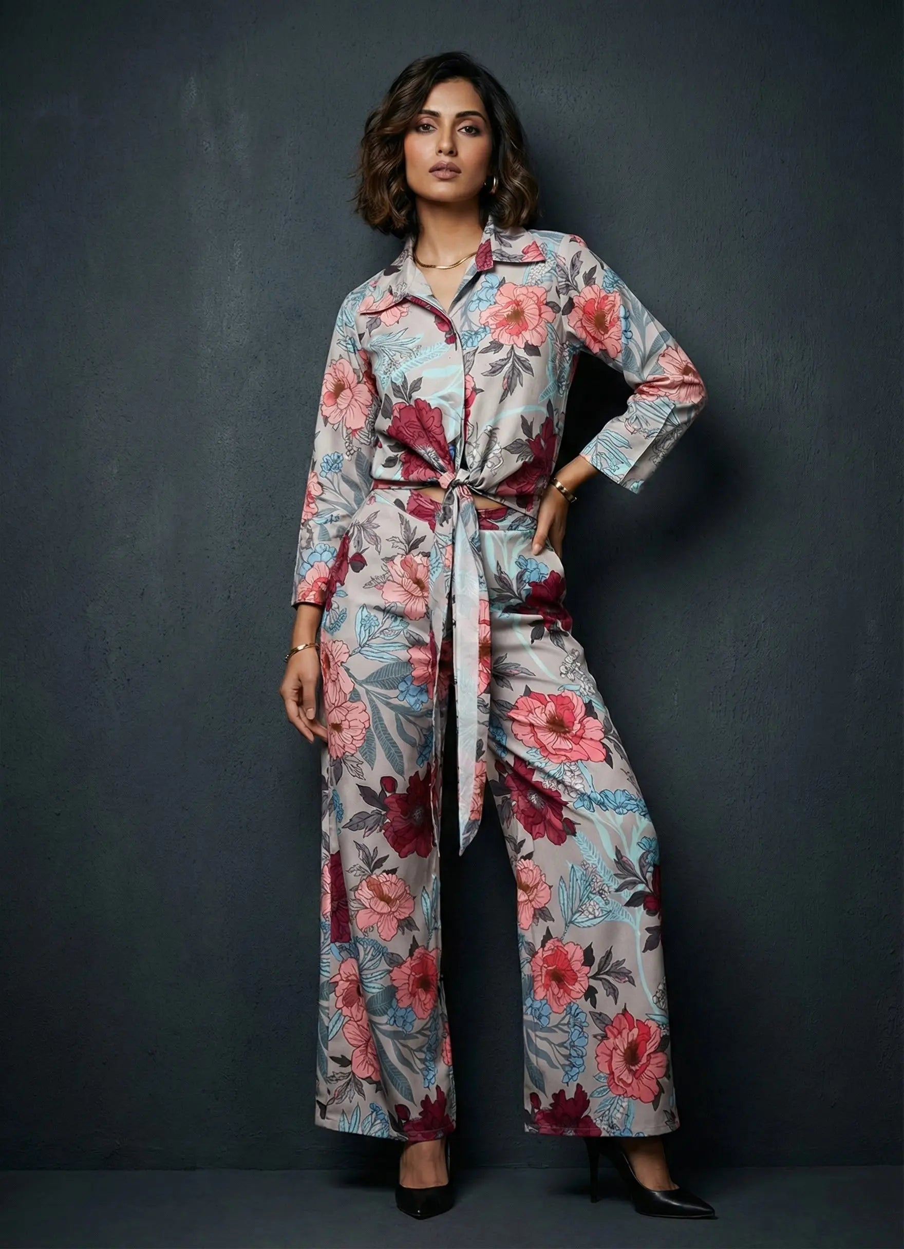 Elevate your style with this stunning khaki shirt and pant set! The ¾ sleeve shirt features a classic collar neck, elegant cuff sleeves, and a beautiful floral print that adds a touch of femininity. The matching pant has a comfortable full-length design with a half belt and half elastic closure, providing a flattering fit.