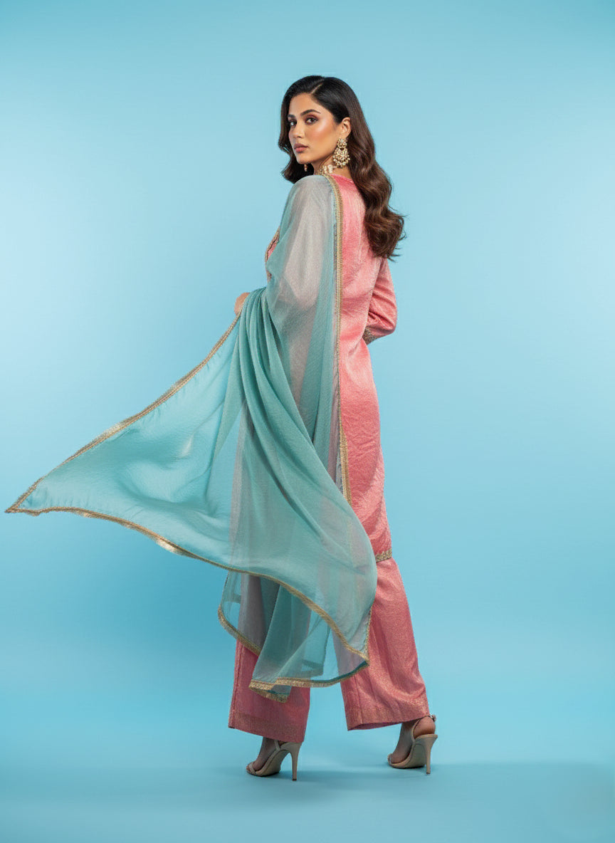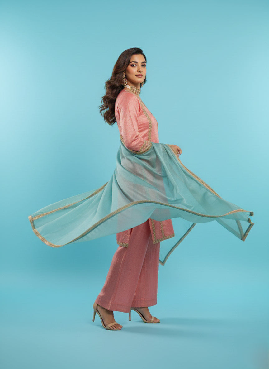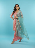 Grace your festive look with this charming blush pink organza kurti set.The plain knee-length kurti features a classy V-neck and ¾ sleeves for a refined touch.Paired with a beautifully embroidered straight palazzo pant for subtle sophistication.The set is complemented with a contrasting sky blue dupatta adding a fresh festive vibe.Crafted in soft organza fandy fabric, it ensures elegance with easy maintenance.