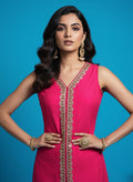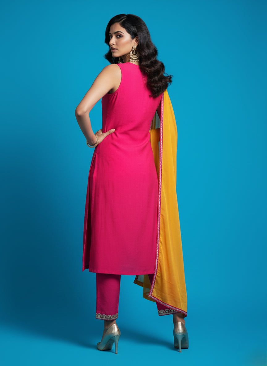 Elevate your festive wardrobe with this vibrant red organza kurti set. The sleeveless, V-neck kurti falls just below the knee for a graceful silhouette. Paired with blush pink straight palazzo pants featuring delicate motif embroidery.A mustard dupatta adds a striking contrast, completing the festive look.Crafted in soft organza fandy fabric for elegance and gentle machine wash care.