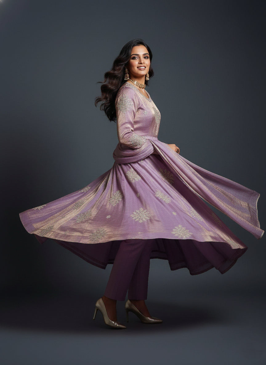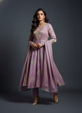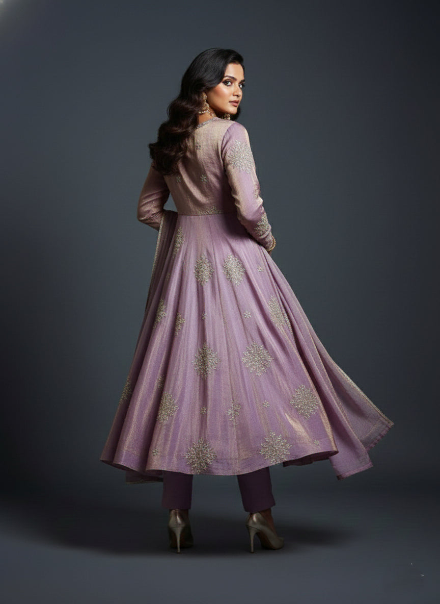A delicate lavender Anarkali adorned with intricate motif embroidery. Designed with ¾ sleeves and a classic round neckline for a graceful look. Lace detailing on the back and sleeves adds subtle elegance. Paired with plain narrow pants for a balanced, refined silhouette. Completed with a soft organza dupatta to enhance the festive charm.