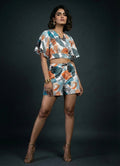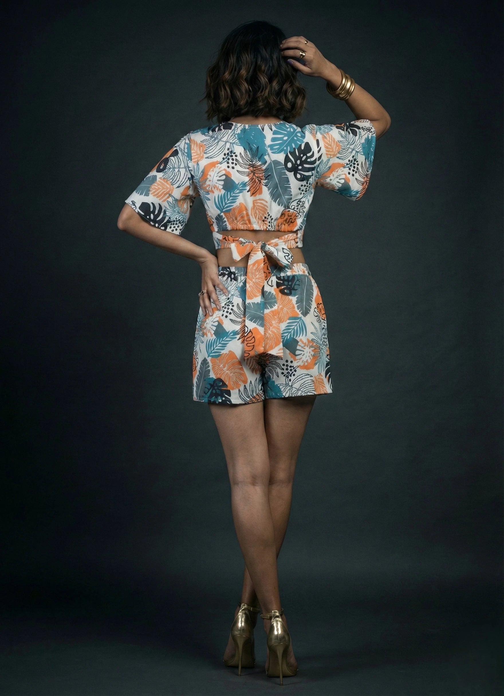 This chic white crop top and matching bottom set exudes effortless style and comfort. The crop top features short flared sleeves and a flattering V-neck, enhanced by a vibrant leaf print for a refreshing look. With an above-knee length, it’s perfect for both casual and occasional wear.