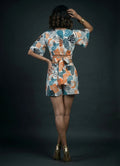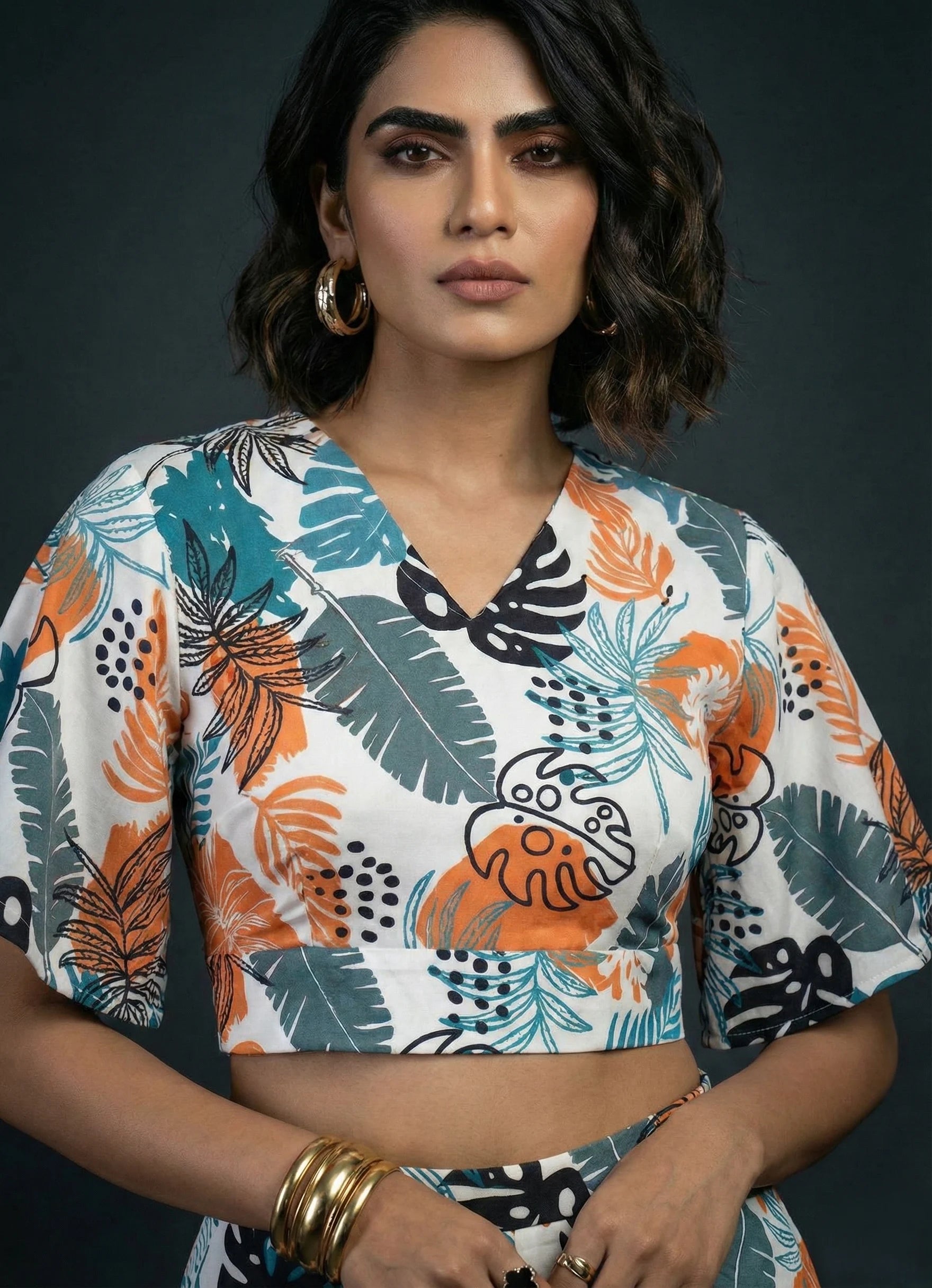 Made from soft Cotton Blend with a digital print, it ensures comfort and easy maintenance with a gentle machine wash. The matching white bottom, also with a leaf print, offers an above-knee length and features a half belt and half elastic closure for a flexible, flattering fit. Ideal for various occasions, this ensemble is both stylish and versatile.