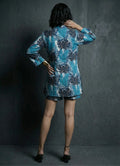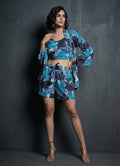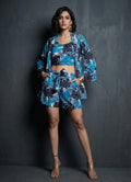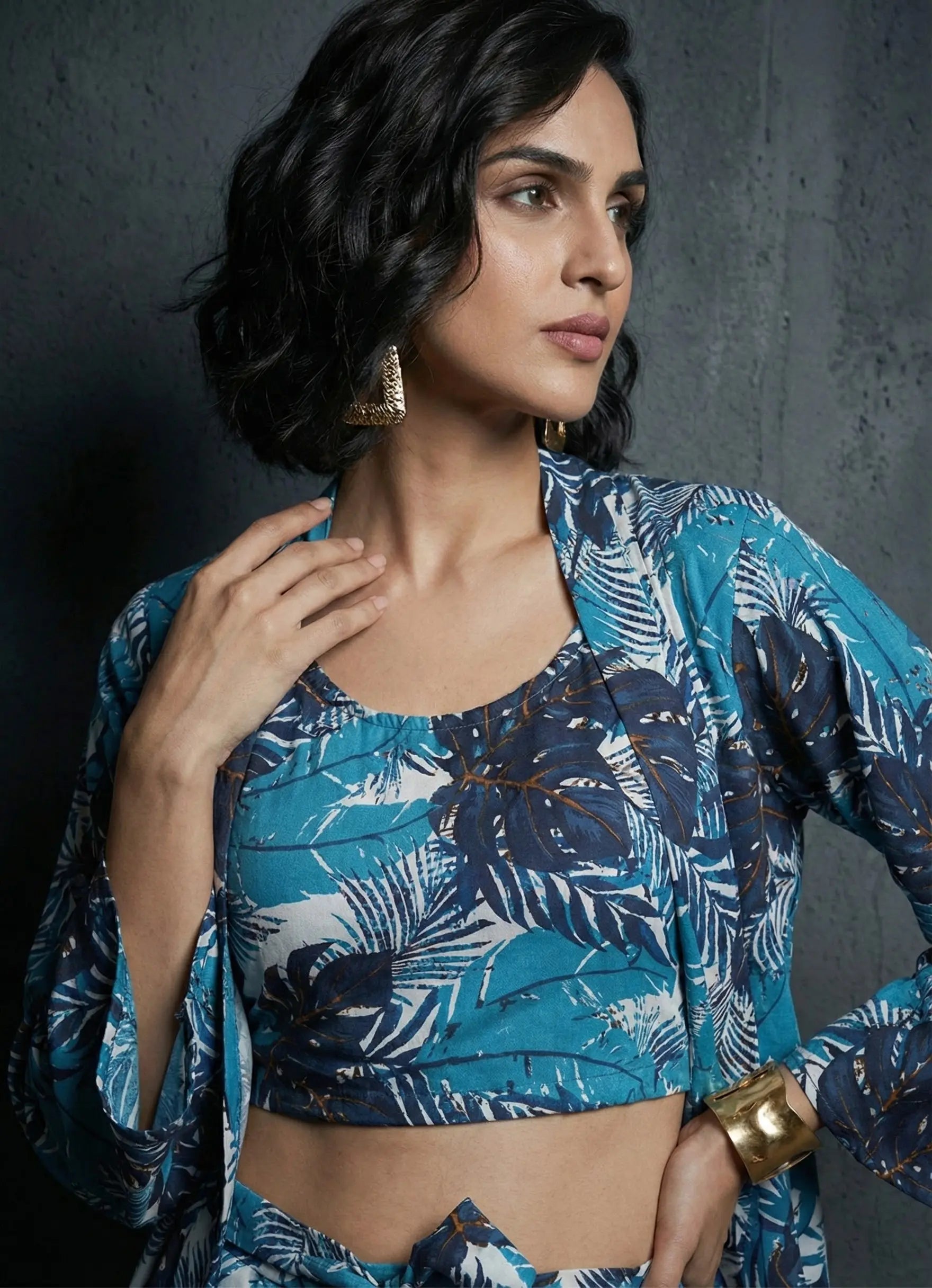 Fall in love with this gorgeous blue crop top and bottom set! The top features a classic round neck, elegant long bell sleeves, and a stunning leaf print that adds a touch of nature-inspired charm.