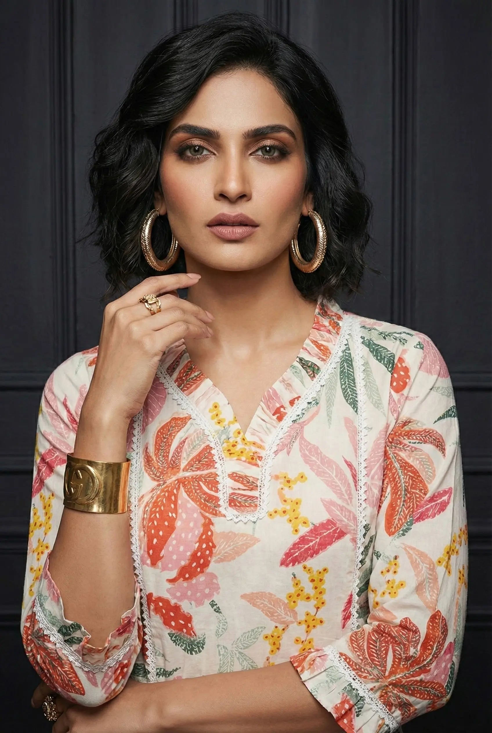 This stylish creamy yellow peplum top set combines elegance and comfort. The Top features ¾ sleeves, a pleated strap V-neck, and a vibrant leaf print, making it perfect for both casual and occasional wear. Its above-knee length offers a chic look, while the soft Cotton Blend fabric ensures comfort with easy maintenance.