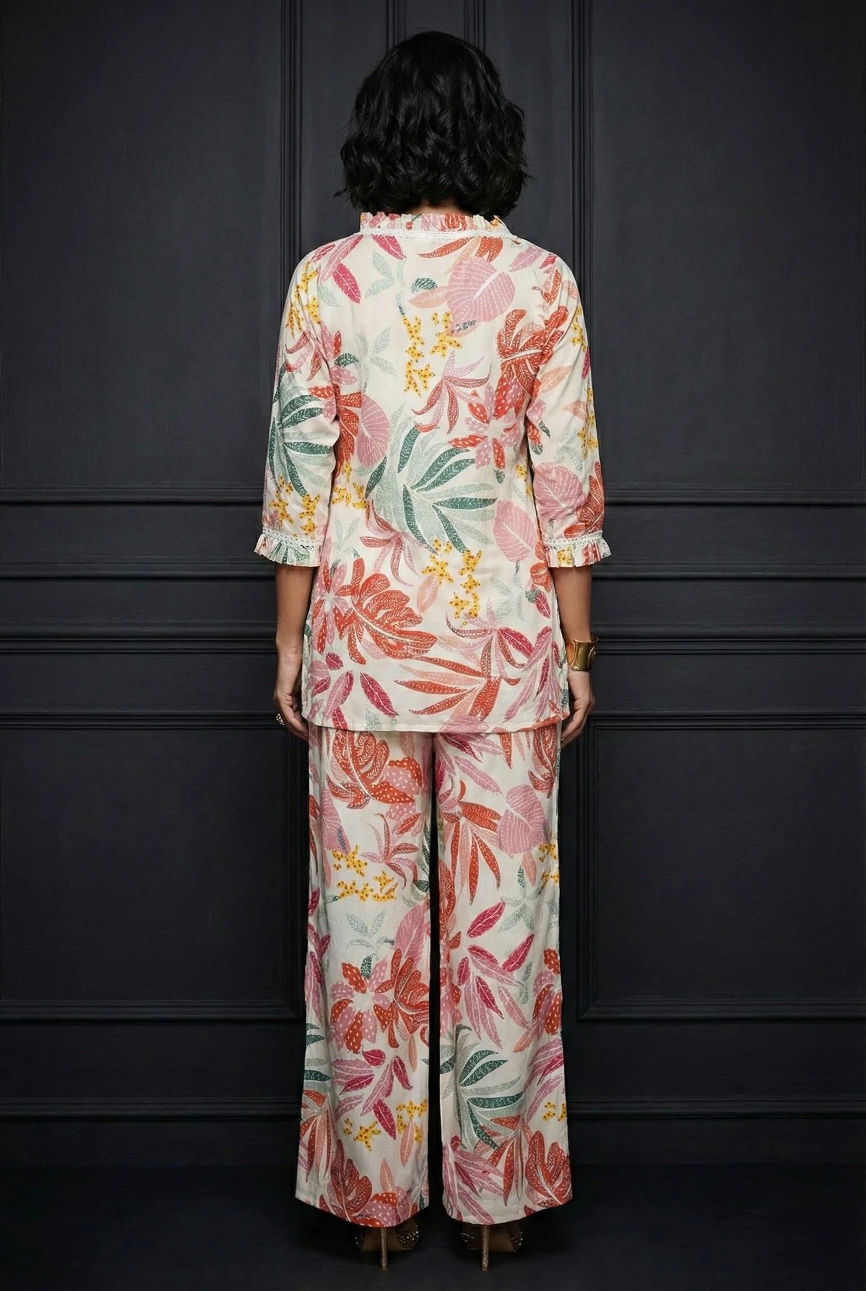 The matching full-length bottoms with a leaf print feature a half belt and half elastic closure for a flexible, flattering fit. Ideal for a variety of occasions, this ensemble offers effortless style and versatility.