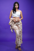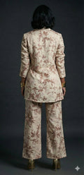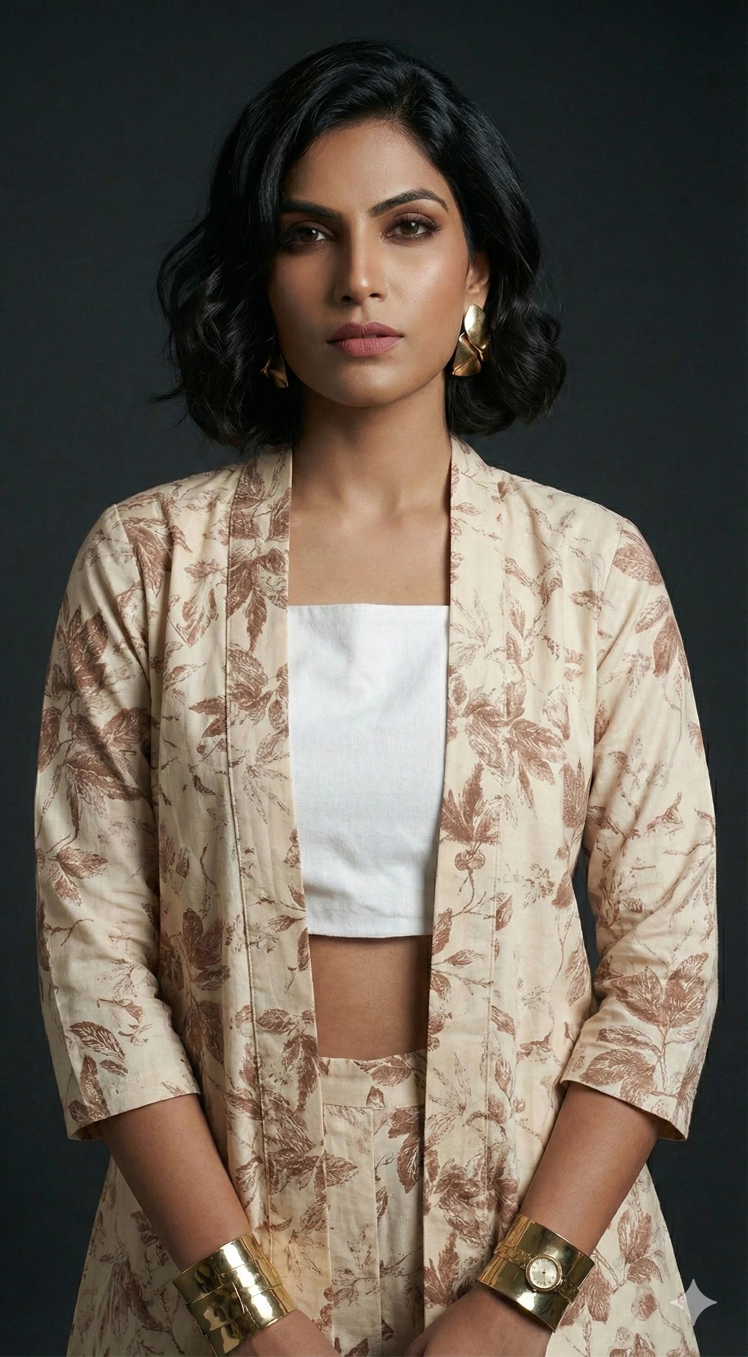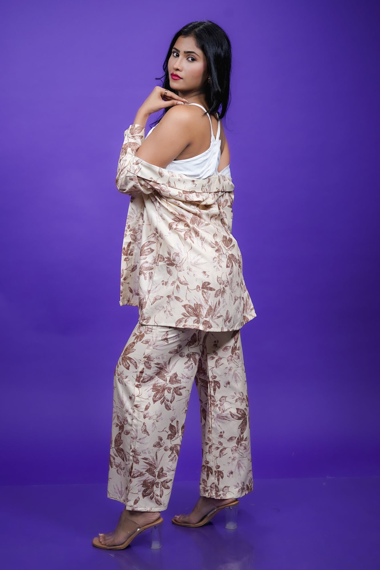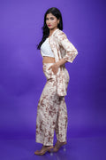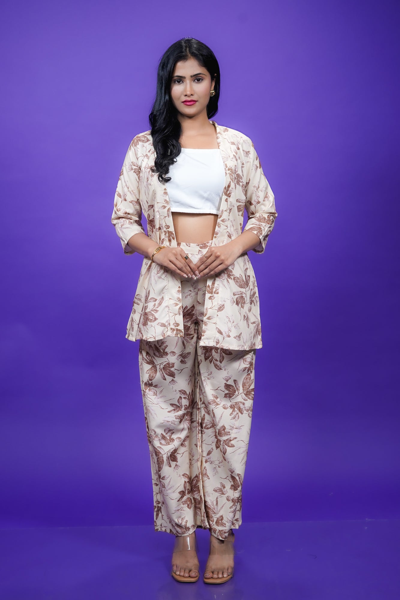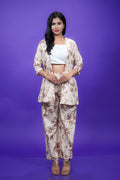 A two piece set of jacket and pant is a comfortable and easy ware. Crafted out from lemon icing shaded Cotton Blend fabric consists of a regular three-fourth sleeve and a open jacket pattern paired up with a flared pant. Pant consists of elastic at back for comfortable fit.