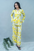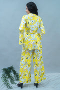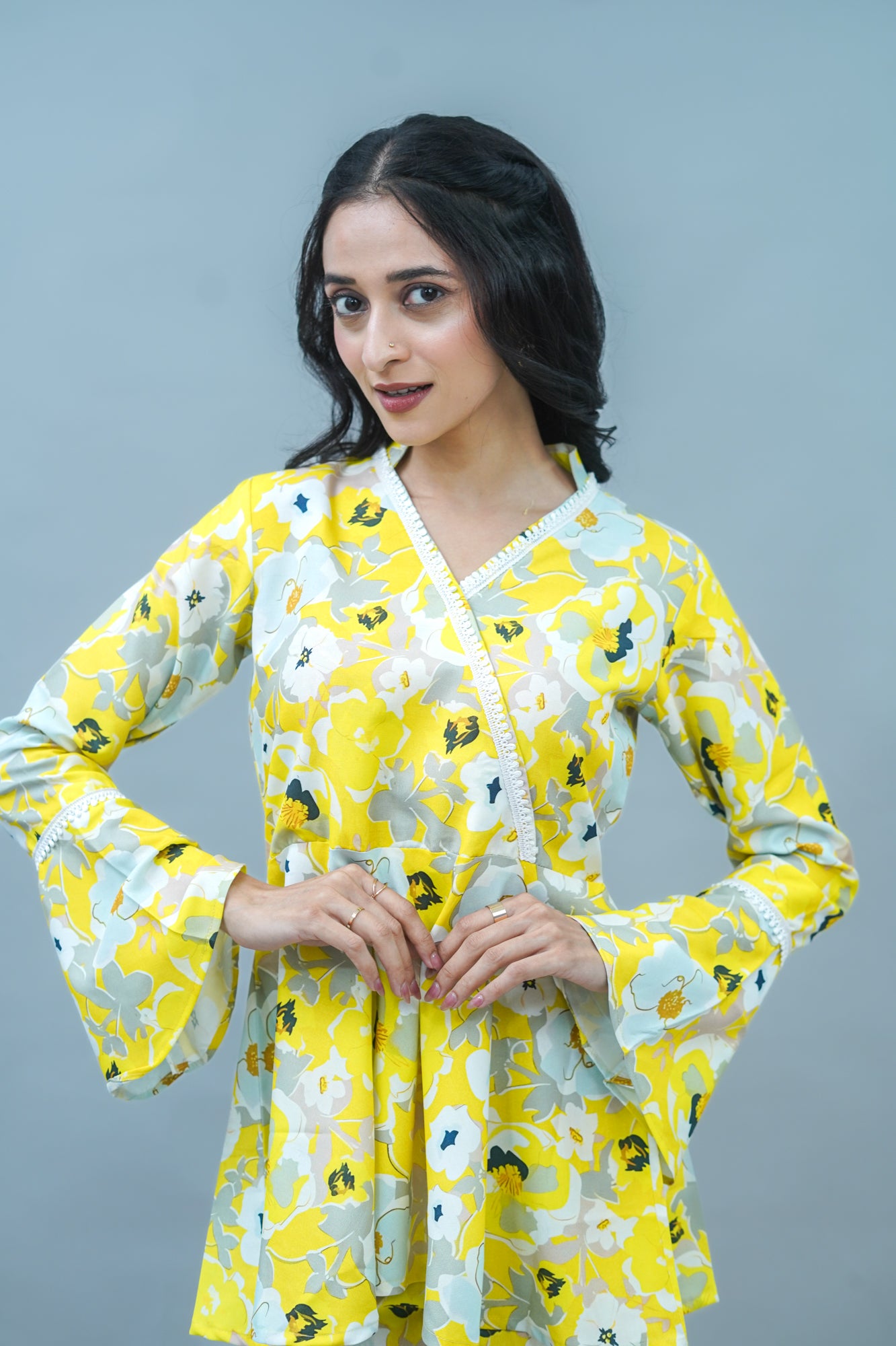 This charming Lemon Yellow Co-Ord Set is designed to bring elegance and comfort to your wardrobe. The overlap peplum top features long bell sleeves, a flattering V-neckline, and a vibrant floral print, with an above-knee length for a playful touch.
