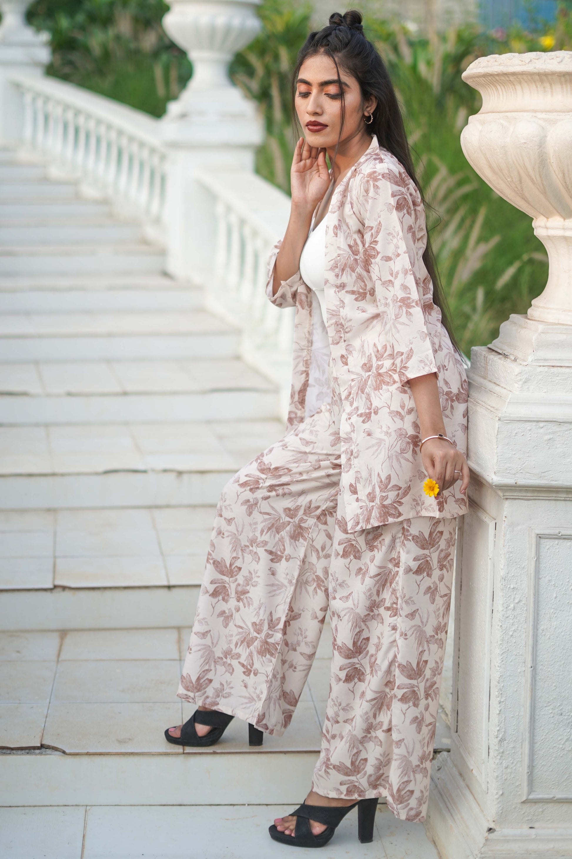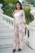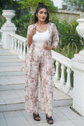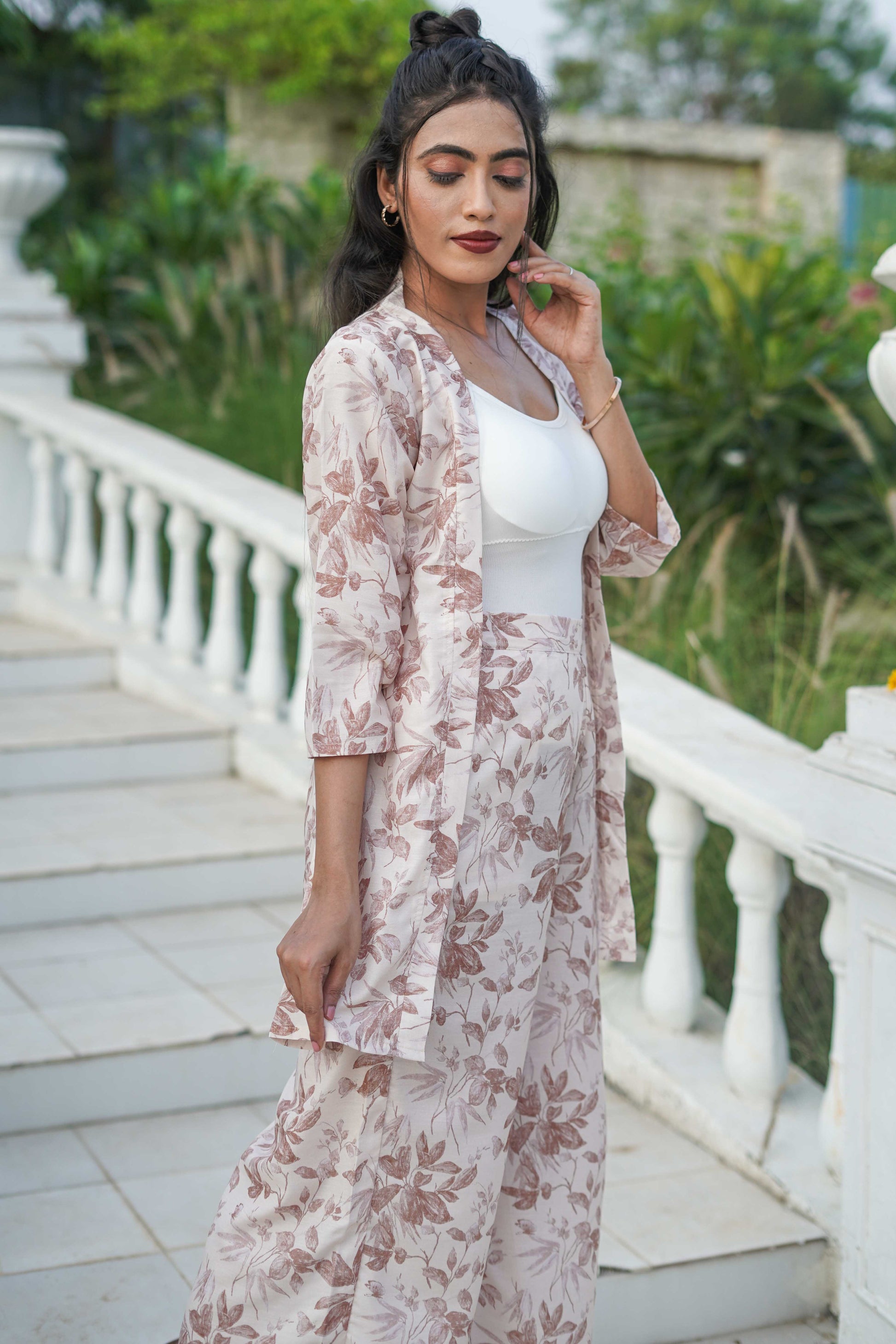 A three piece set of inner, jacket and pant is a comfortable and easy ware. Crafted out from lemon icing shaded Cotton Blend fabric consists of a regular three-fourth sleeve and a open jacket pattern paired up with a flared pant. Pant consists of elastic at back for comfortable fit.