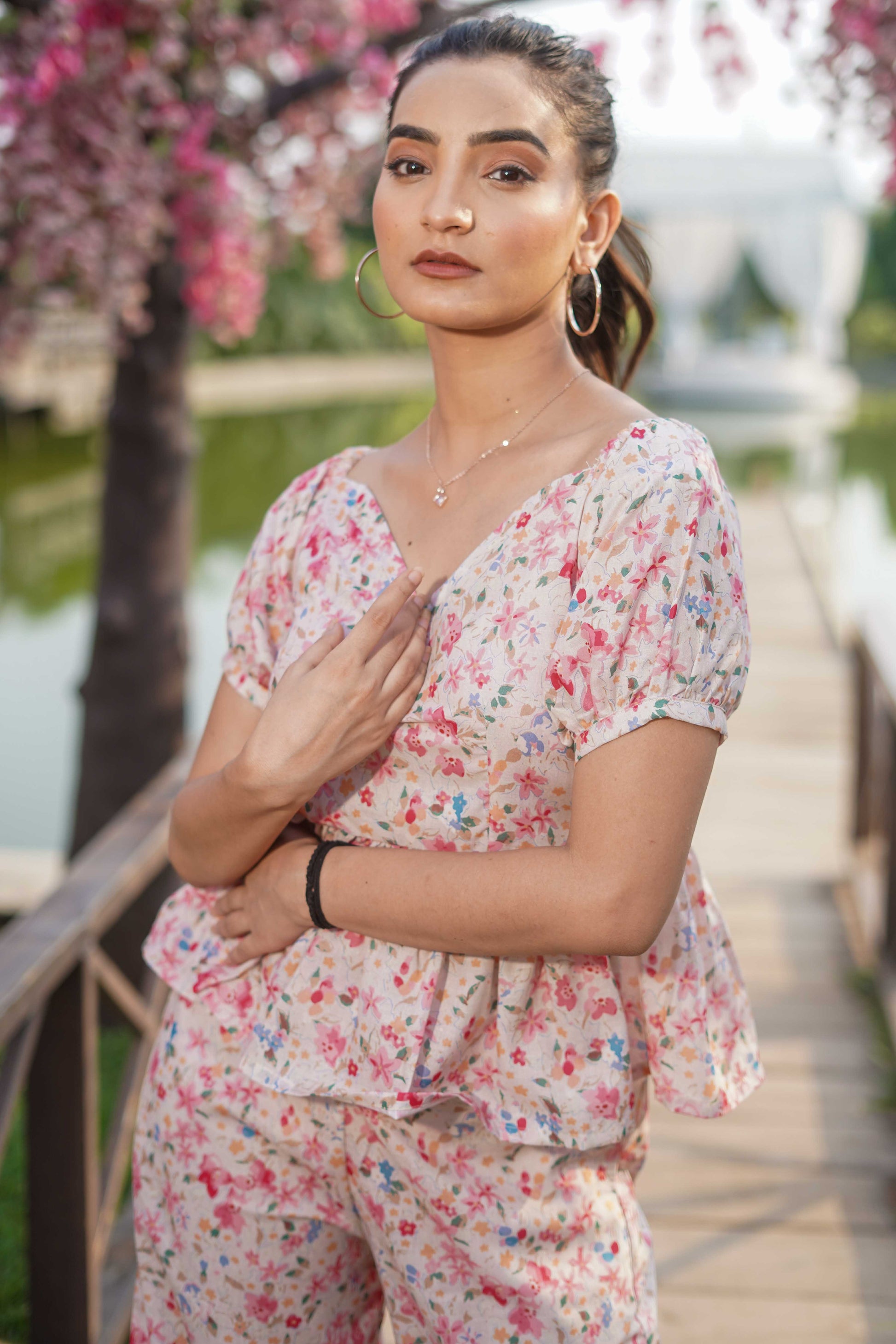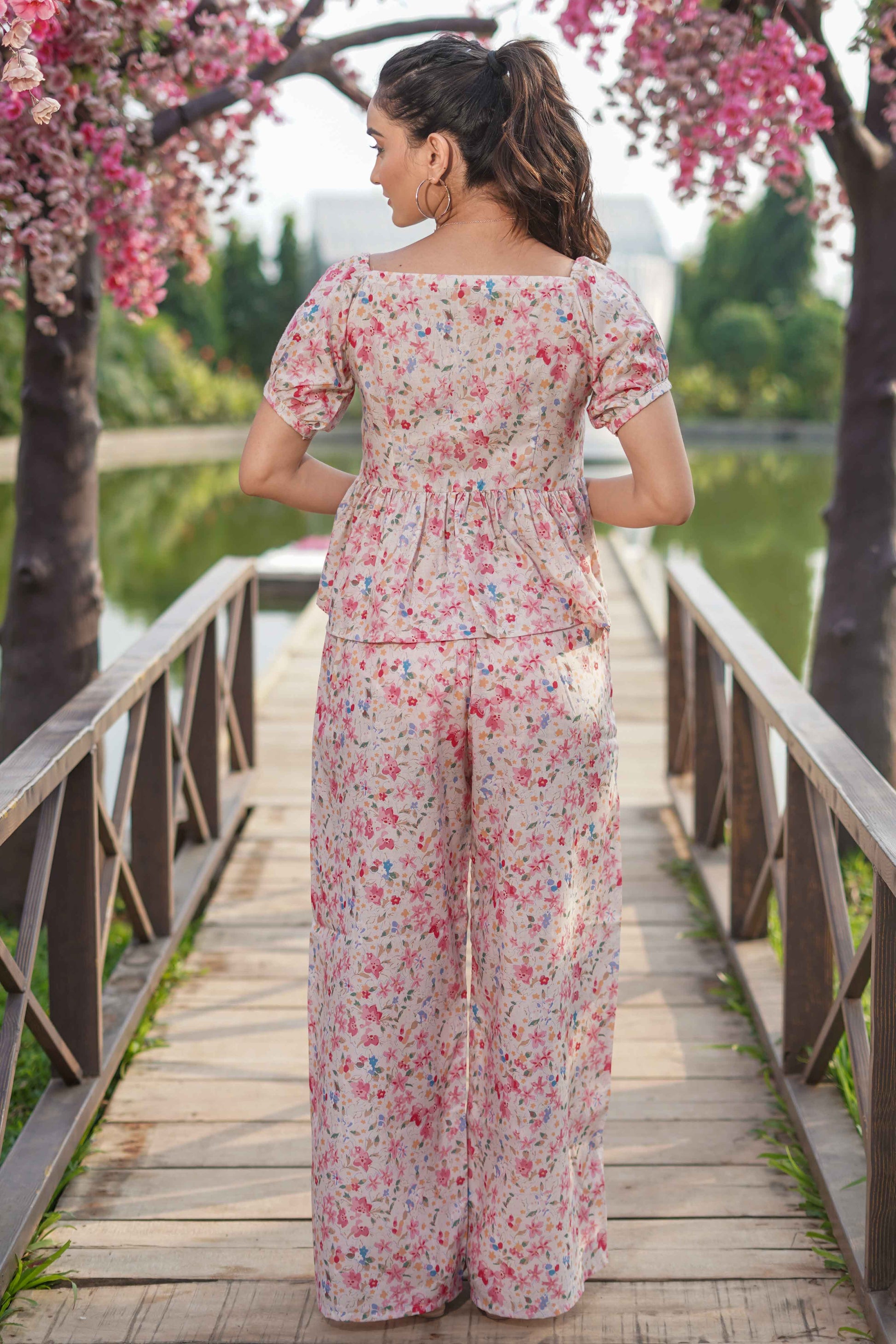 Time to give your wardrobe a new and fresh look. This multi-coloured floral printed co-ord set patterned out from light beige cambric fabric is perfect. It has a sweet heart cut neckline with elastic on shoulder, balloon sleeves and gathered hemline paired up with flared pants.