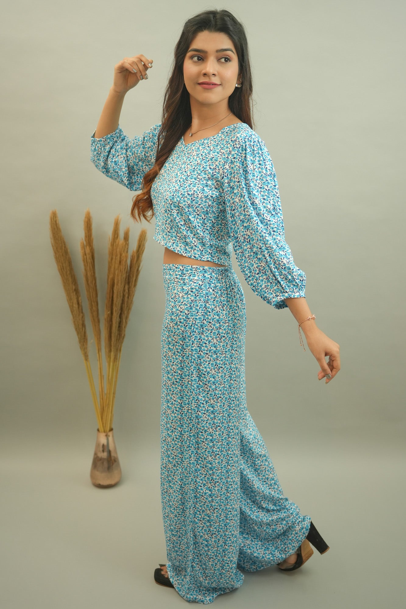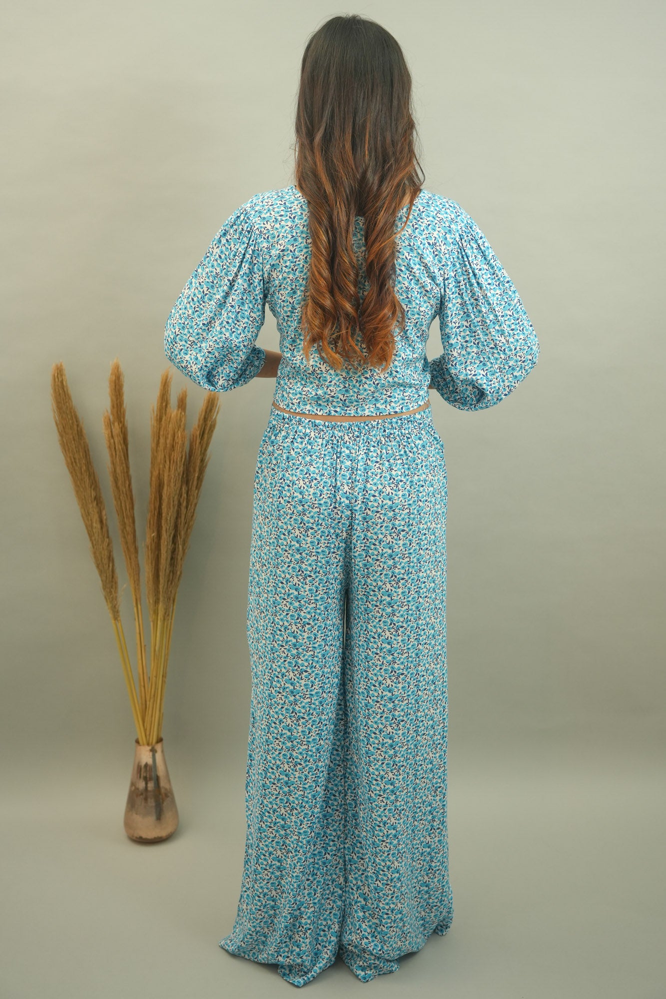 This light blue co-ord set is crafted out of soft floral printed cotton fabric. It consists of a crop top with three fourth balloon sleeves, princess neckline and long flared pants with elastic on back belt for comfortable fit.