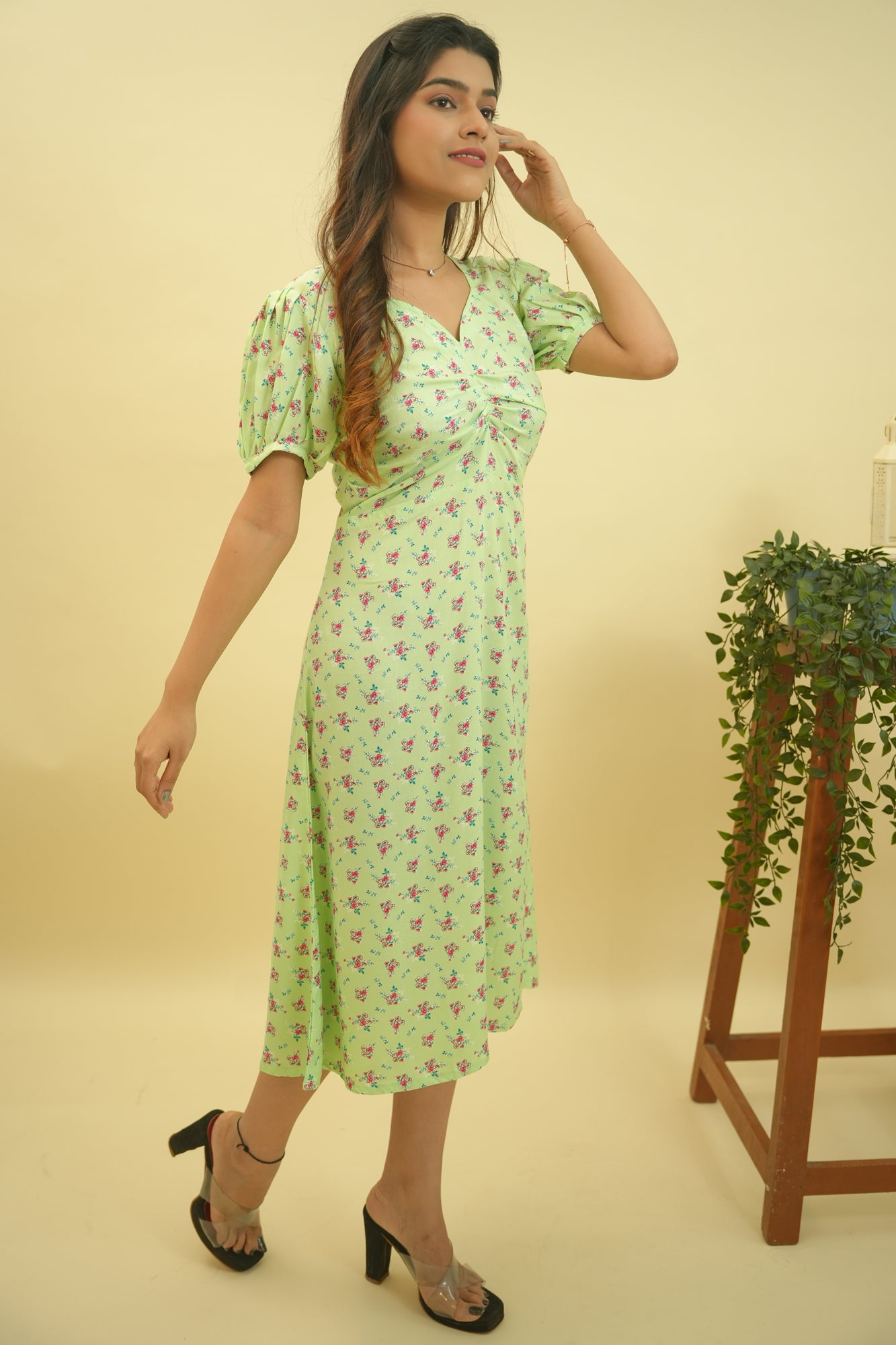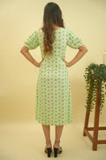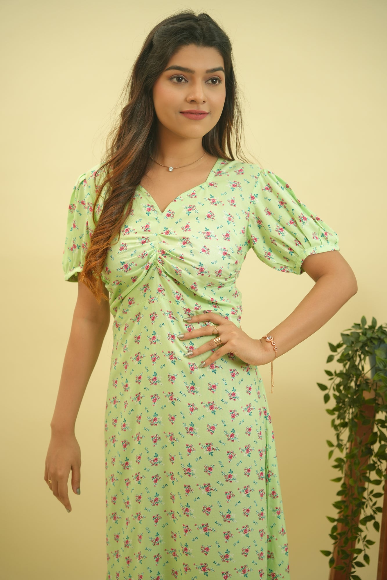 Description: Fill your wardrobe with our new collection of fresh colours. This is one of outfit crafted out from light green floral printed Cotton Blend fabric which is comfortable and wearable any season. This pattern consists of a sweetheart neckline white styling on yoke, calf length straight cut and puffed sleeves.