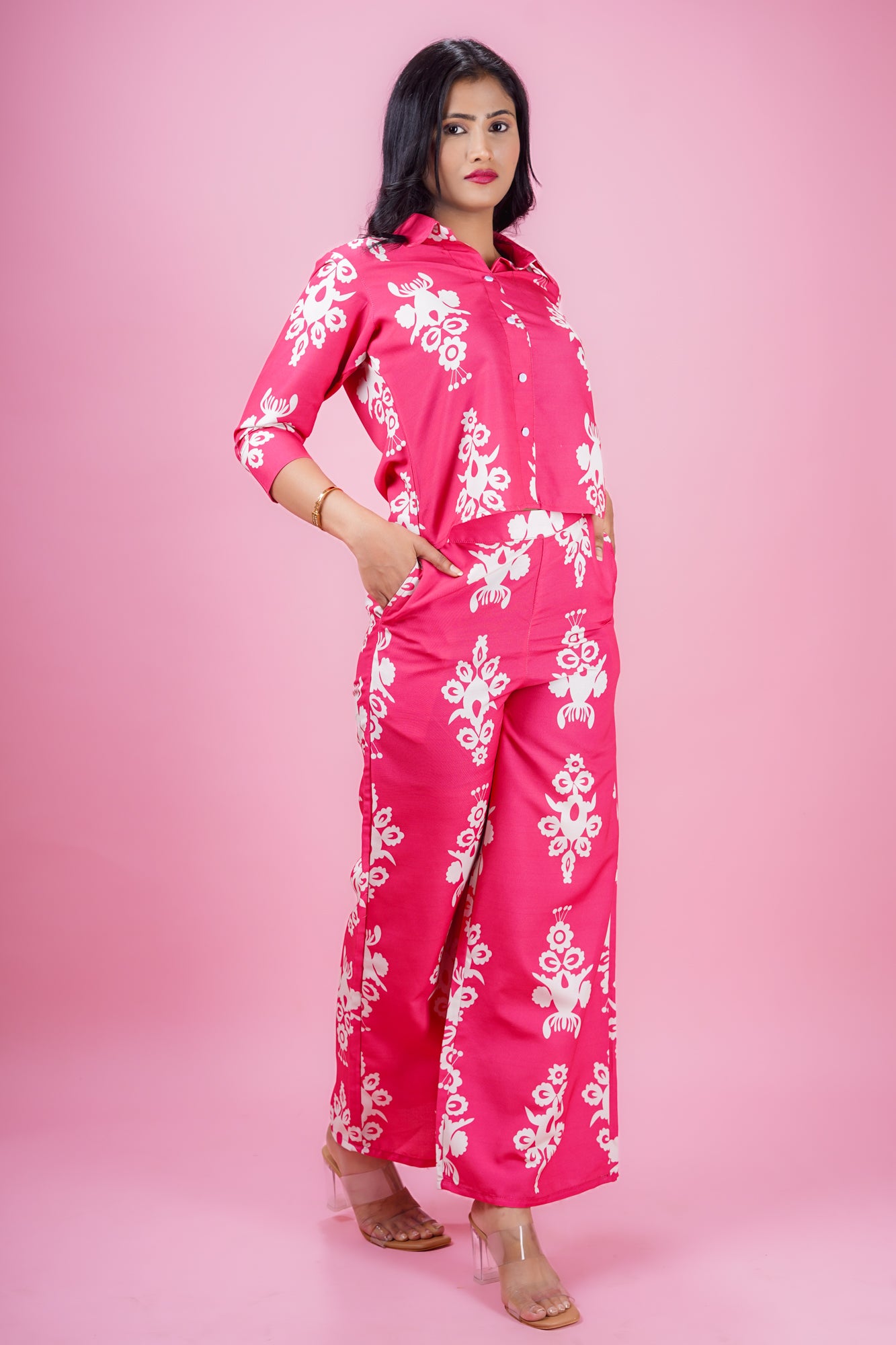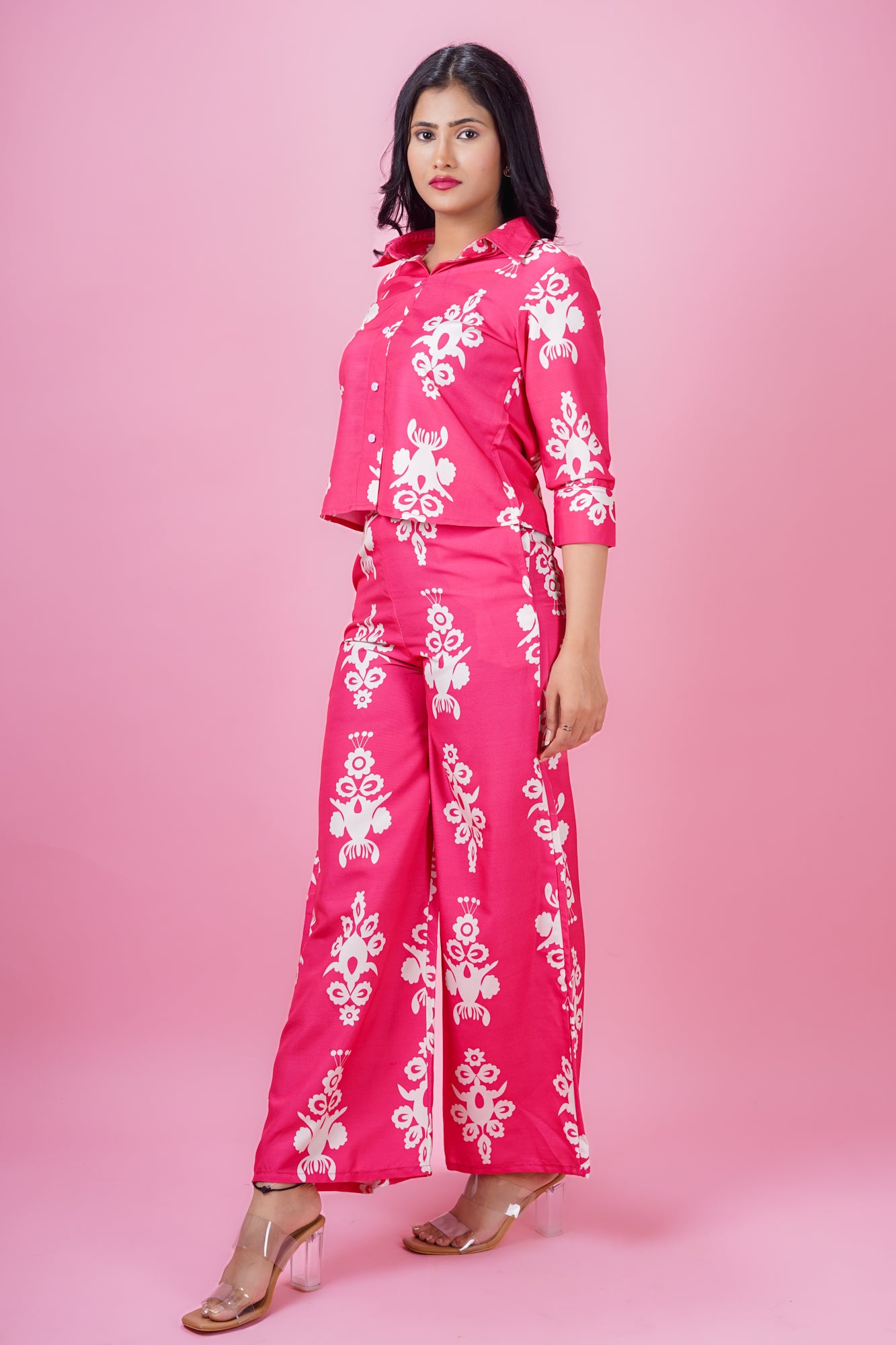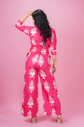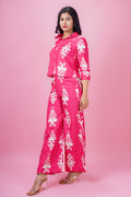 Infuse your wardrobe with vibrant charm in this magenta co-ord set featuring a waist-length top adorned with elegant motif prints. Styled with ¾ cuff sleeves, a sharp collar neck, and crafted from soft, breathable Cotton blend fabric, this ensemble blends structure with comfort. Paired with matching full-length palazzo pants and a half-belt, half-elastic waistband, it offers both style and ease. Ideal for occasional outings or regular wear, this set is your go-to for a bold yet polished look.