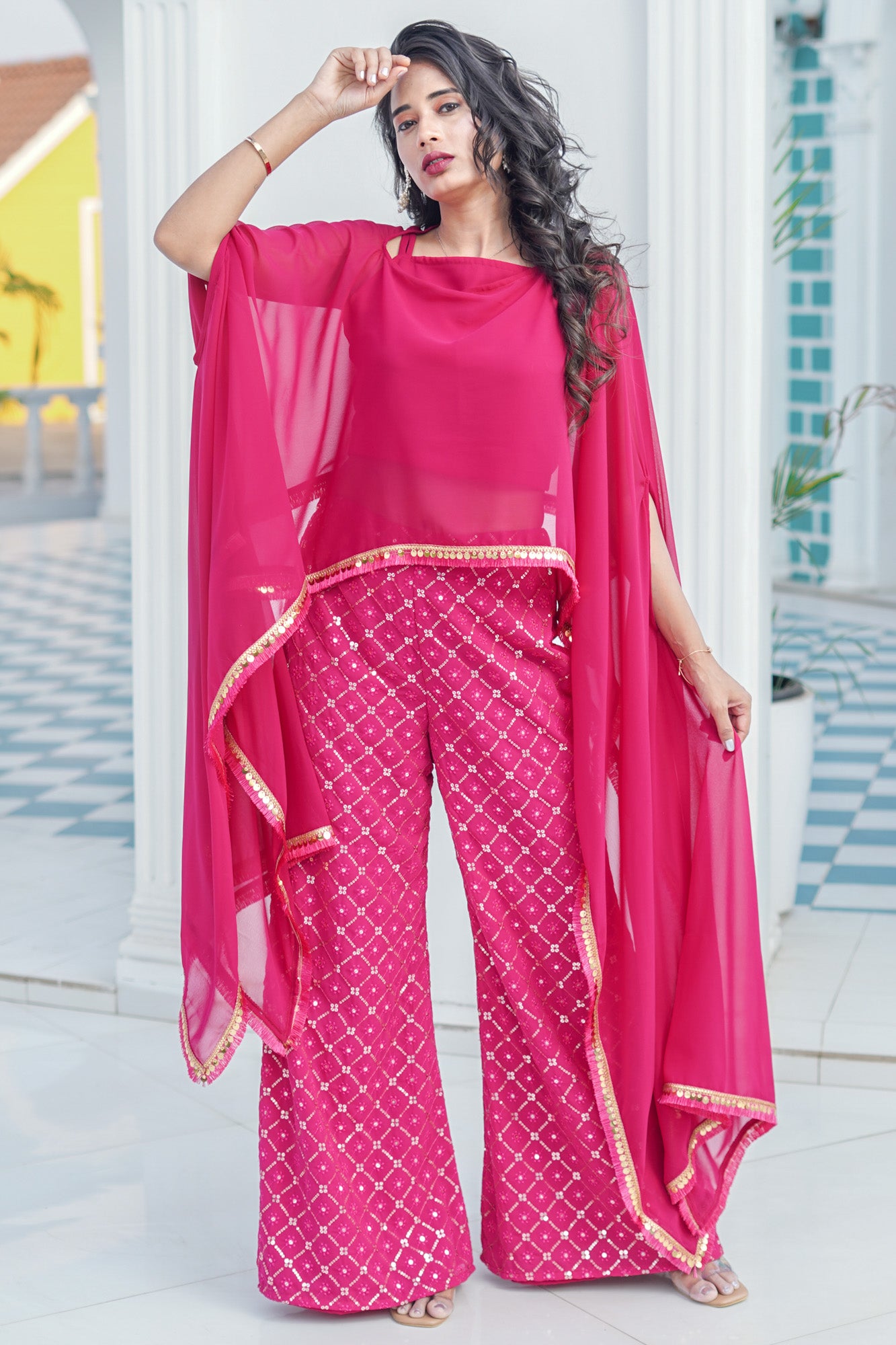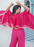 Introducing our "Magenta Majesty" ensemble, a vibrant and elegant outfit perfect for festive occasions. This three-piece set includes a stylish cap, top, and pant, all crafted from luxurious Georgette fabric in a stunning magenta pink hue.
