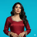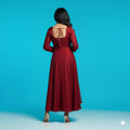 A stunning maroon Anarkali set adorned with delicate floral scallop embroidery.