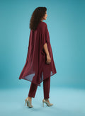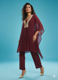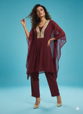 Elevate your festive look with this maroon georgette kaftan featuring 3/4 sleeves. Styled with a sweetheart neck and rose gold lace detailing for subtle elegance. Comes with a matching maroon inner of below-knee length for layered charm. Paired with full-length straight palazzo pants in plain Roman silk with full elastic waist.