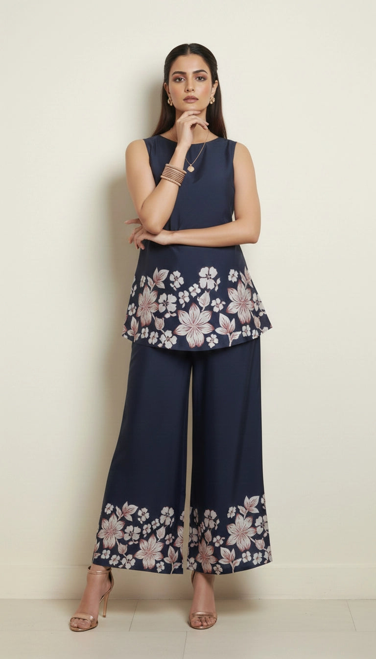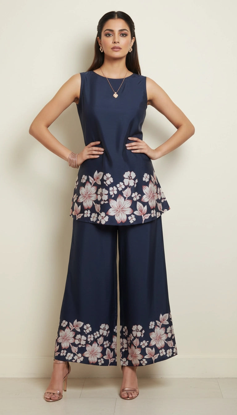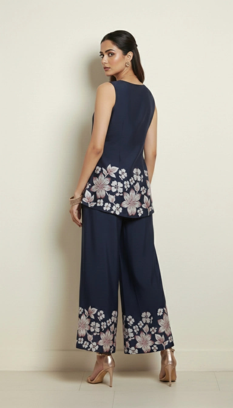 A chic navy sleeveless top paired with flowy wide-leg palazzos, both highlighted with soft floral print detailing along the hem. Crafted for a clean, modern silhouette with effortless movement and comfort.
