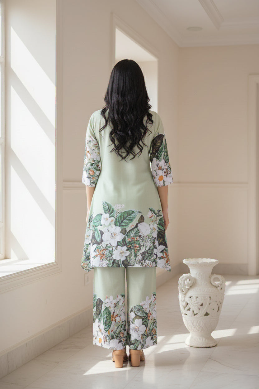 Embrace effortless elegance with this mint green kurti and palazzo set, featuring a delicate floral placement print that adds a touch of femininity and charm. The thigh-length kurti comes with a graceful V-neckline and comfortable elbow sleeves, offering a flattering and airy silhouette perfect for both occasional and regular wear. Made from soft Cotton blend fabric, it promises comfort and breathability with gentle machine wash care. The set is completed with matching full-length palazzo pants, designed with a half belt and half elastic waistband for a comfortable, flattering fit. A perfect blend of style and functionality for any wardrobe.