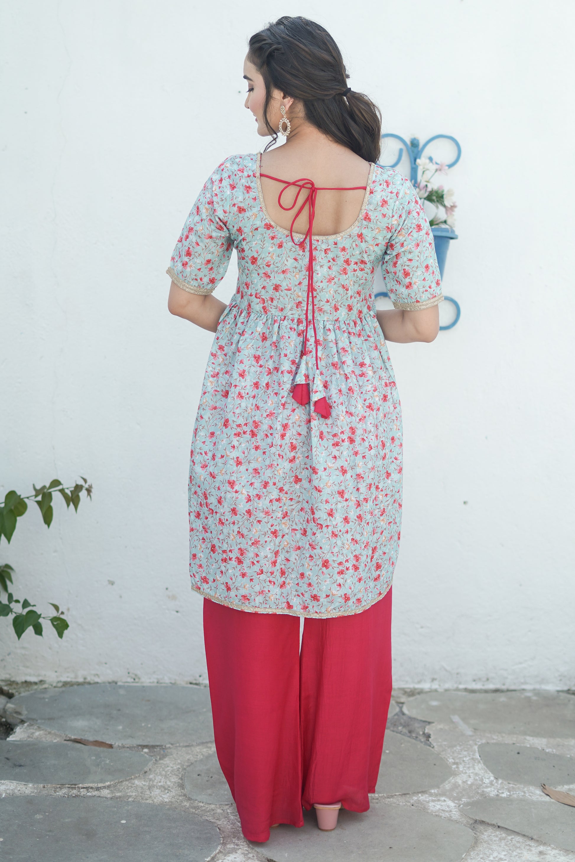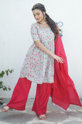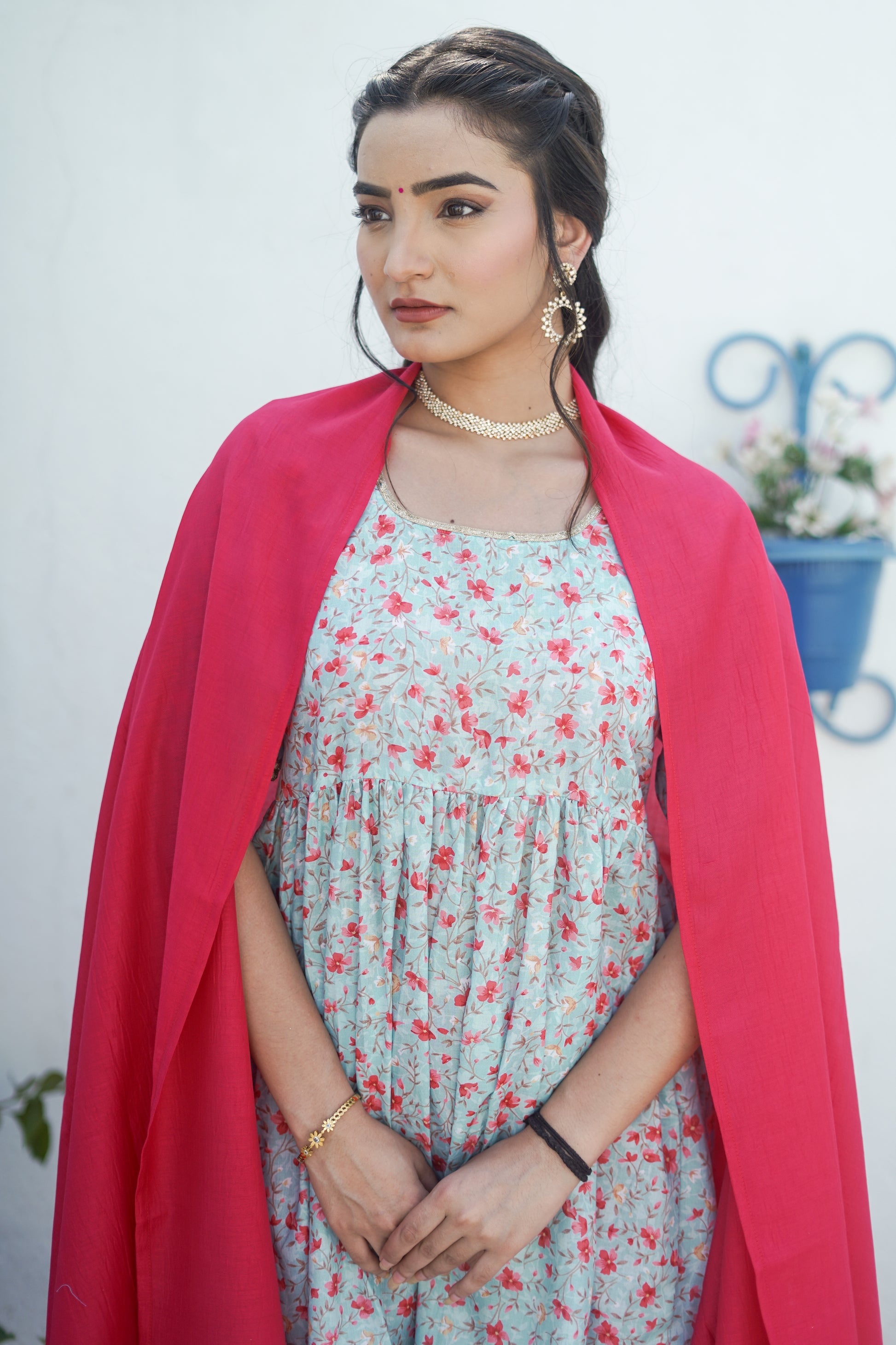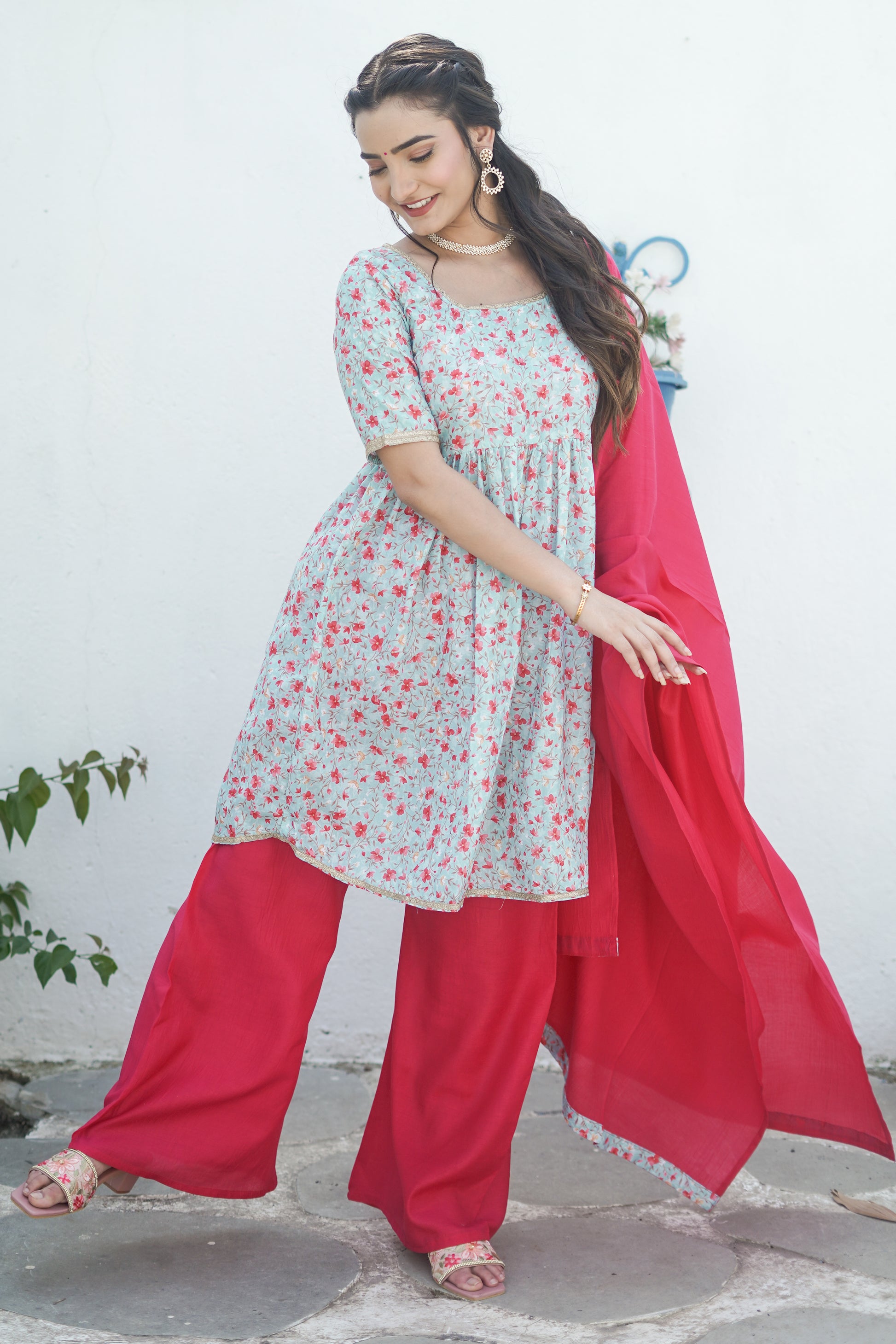 Add pretty prints of pinks to your collection. Crafted out from Cotton Blend mint green fabric consists of rounded square neckline, half sleeves, gathered hemline knee length kurta with embellishment of golden shimmer lace on neckline, sleeve round and bottom round adds up a glamour to the set. This set includes magenta pink palazzo and dupatta.