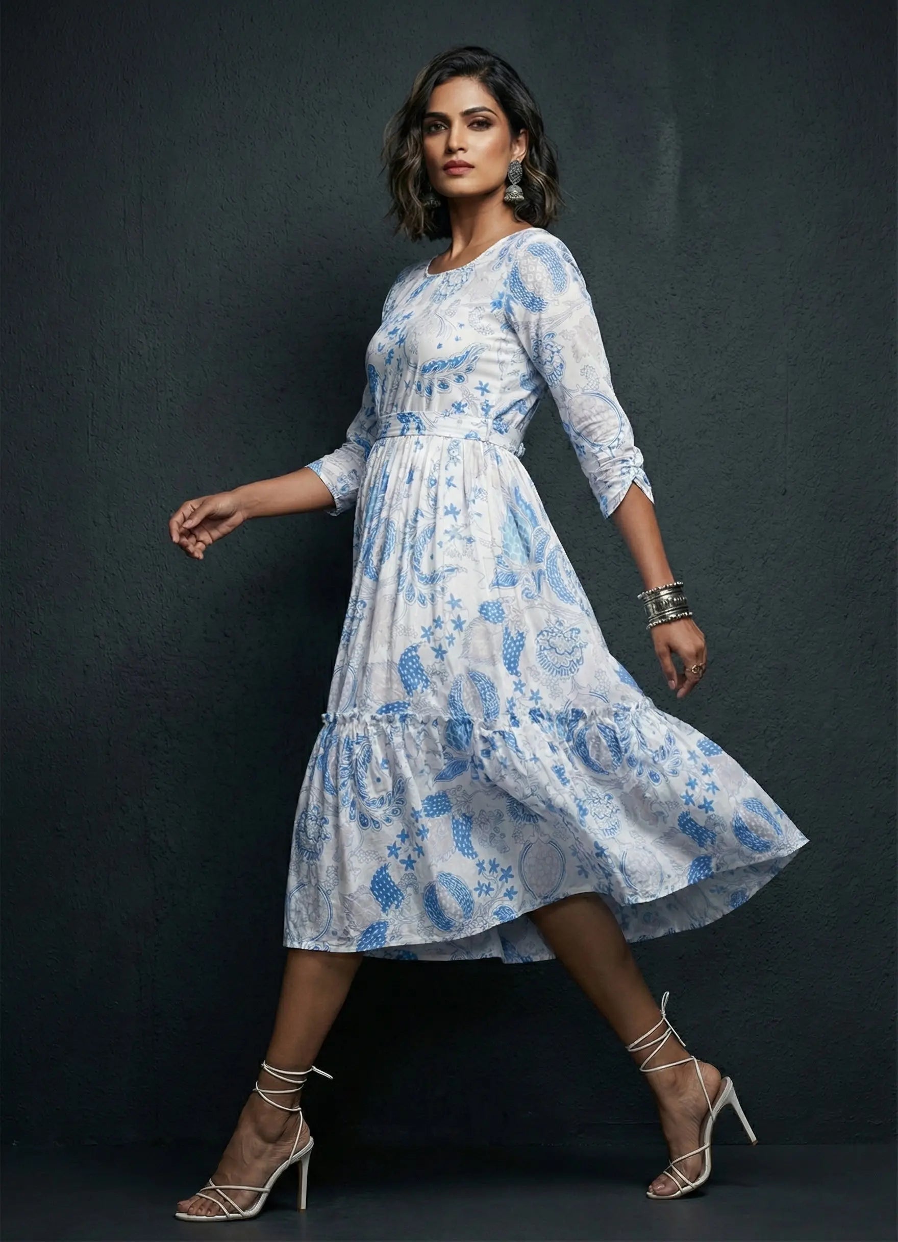 Introducing our Silhouette ensemble: a chic one-piece dress, perfect for casual occasions. Crafted from breathable Cotton Blend fabric, this dress features a charming white base adorned with a beautiful morocco blue floral print. The dress boasts 3/4th plain sleeves and a stylish square neck, offering both comfort and elegance. Adding a touch of flair, the dress is designed with a gathered flare, creating a flattering silhouette that combines sophistication with ease for your casual outings.