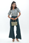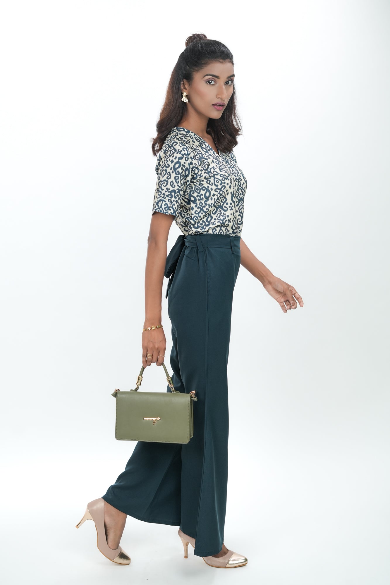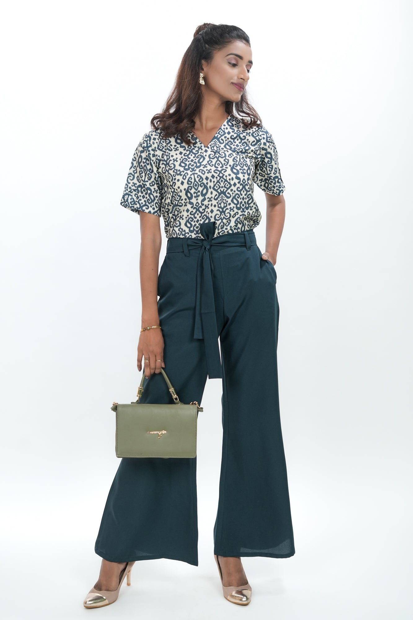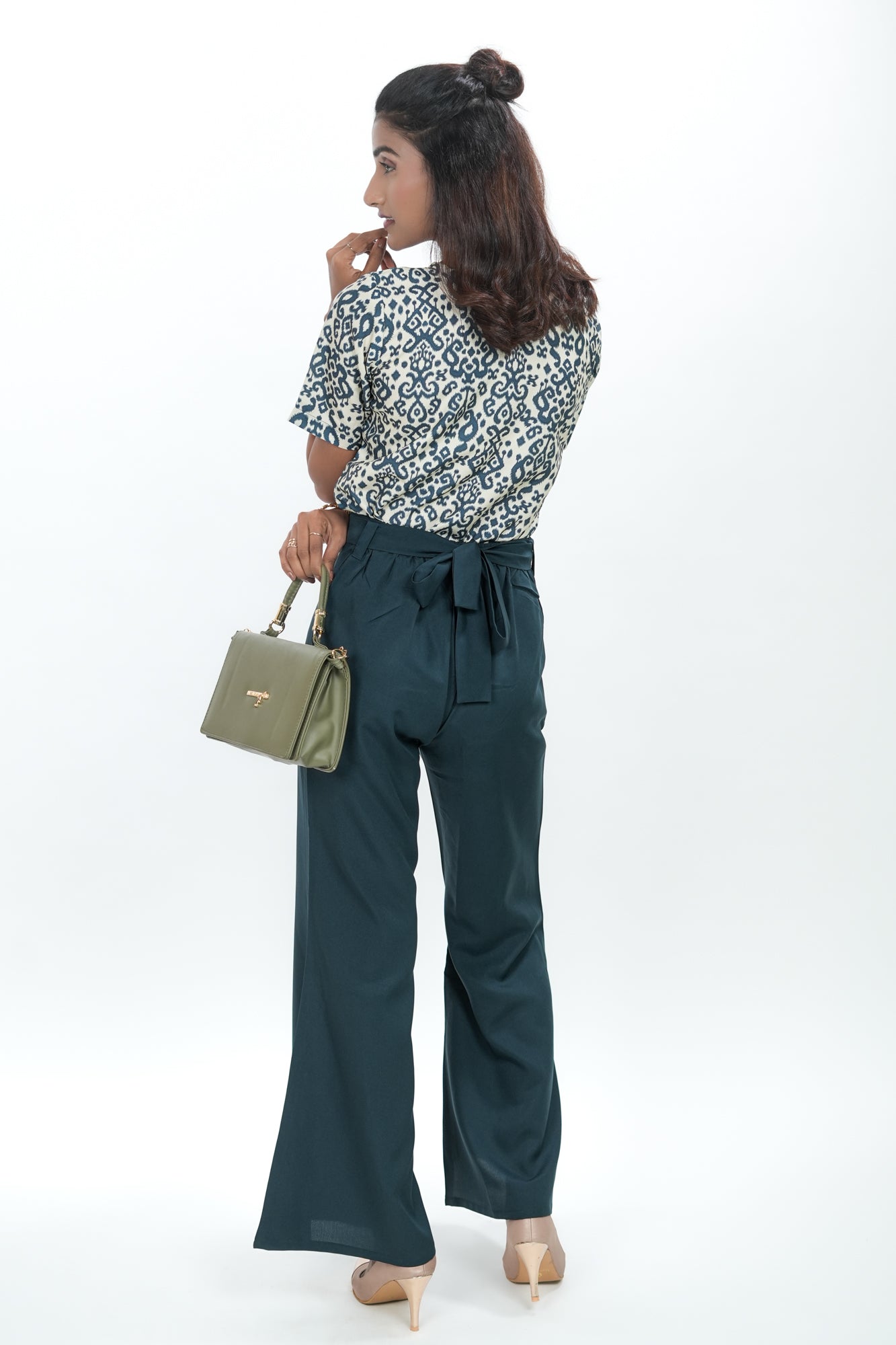 The matching full-length pants echo the same geometrical print, finished with a half belt, half elastic waistband for a flattering and flexible fit. A versatile outfit that transitions seamlessly from work to after-hours.