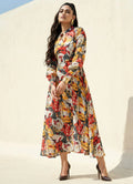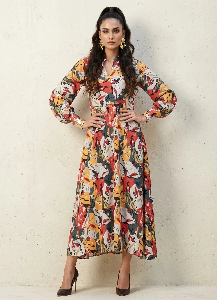 Introducing our Silhouette ensemble: a charming one-piece dress crafted from breathable Cotton Blend fabric, adorned with a lively multicolor abstract print, perfect for casual occasions. This dress features full puff sleeves and a sophisticated collar neck, adding an elegant touch to your look. With a length of 48 inches, this ensemble offers both style and comfort for your casual outings.