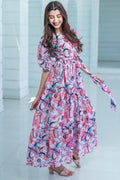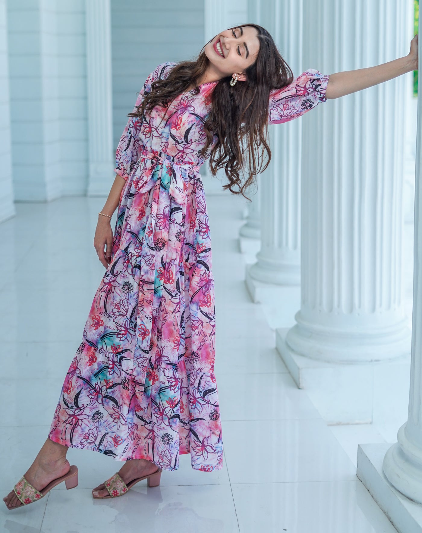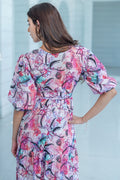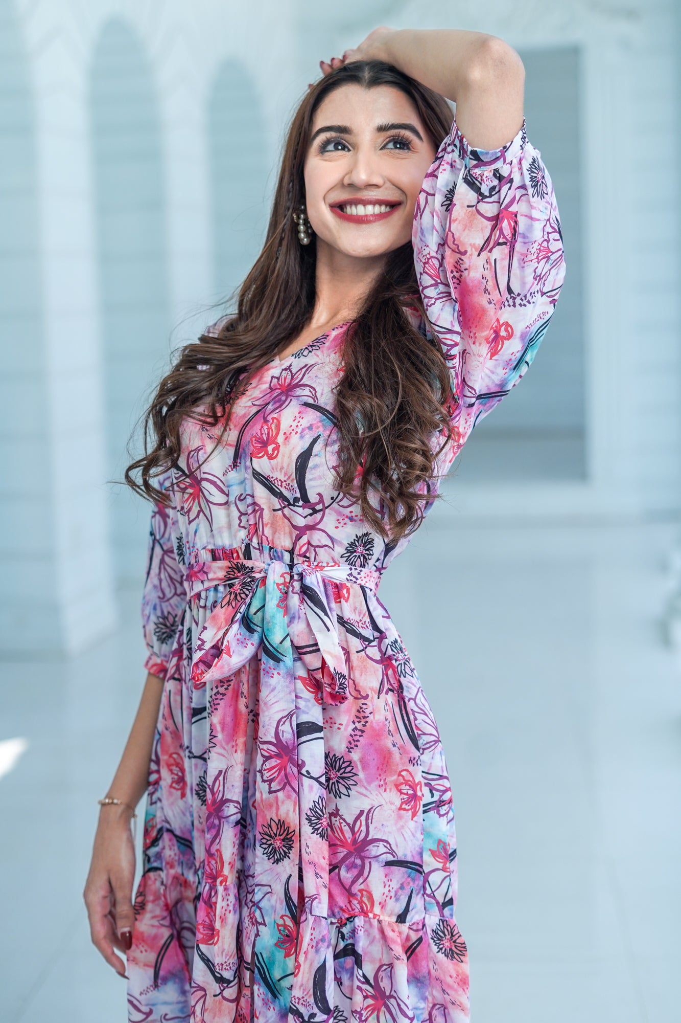Introducing our Silhouette ensemble: a vibrant one-piece dress full flare with bow belt on waist line perfect for casual occasions. Crafted from breathable Cotton Blend fabric, this dress features a captivating multicolor abstract print that adds flair to your ensemble. The dress showcases elegant elbow-length puff sleeves and a flattering V-neck, offering a stylish and comfortable fit. this ensemble exudes casual sophistication, making it ideal for various daytime events or outings.