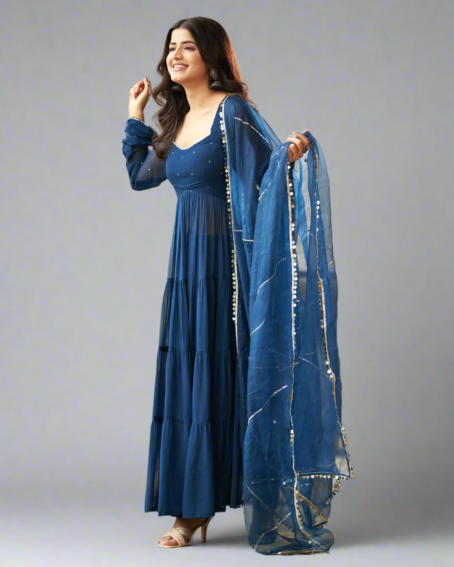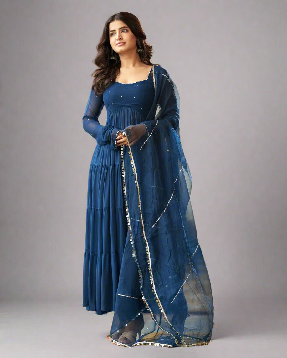 A graceful cobalt blue georgette anarkali with full sleeves and a square neck, paired with a narrow straight pant and a beautifully embroidered gotapatti organza dupatta, perfect for both regular and occasional wear. The below-knee length flowy silhouette adds elegance, while the half-belt half-elastic pant ensures effortless comfort and style.