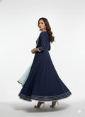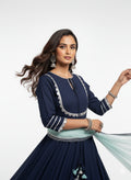 A graceful navy blue ankle-length anarkali crafted in luxurious Roman silk. Styled with a round V neckline and ¾ sleeves for a refined silhouette. Delicate lace detailing on the neck and sleeves adds a touch of elegance. Paired with plain navy blue narrow pants for a sleek and balanced look. Accented with a contrasting sky blue organza dupatta for festive charm.