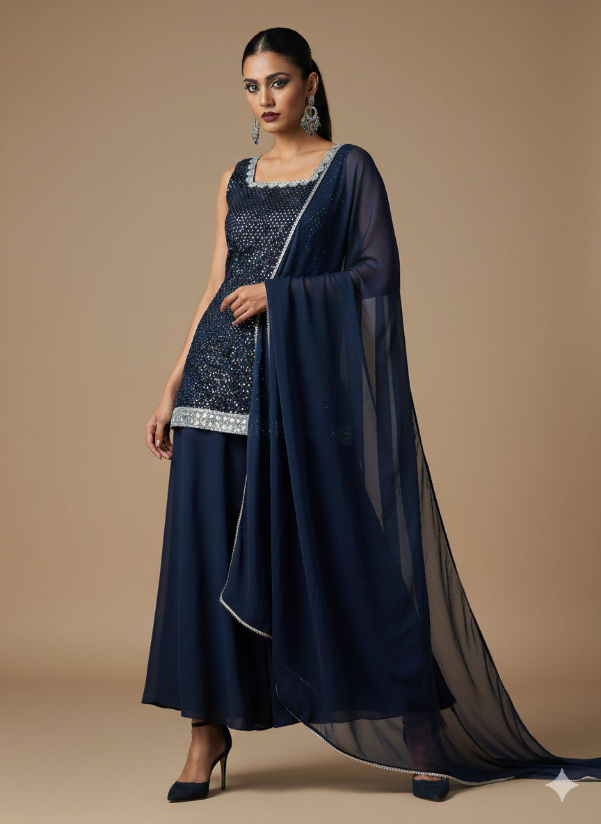 This navy blue georgette ensemble features a sleeveless hip-length kurti adorned with elegant sequin embroidery. The square neckline is beautifully highlighted with delicate lace detailing, adding a touch of grace.Its flowy flare gharara pant in matching navy blue offers comfort with a half-belt, half-elastic closure.A plain dupatta balances the embellished kurti, creating a subtle yet festive look.