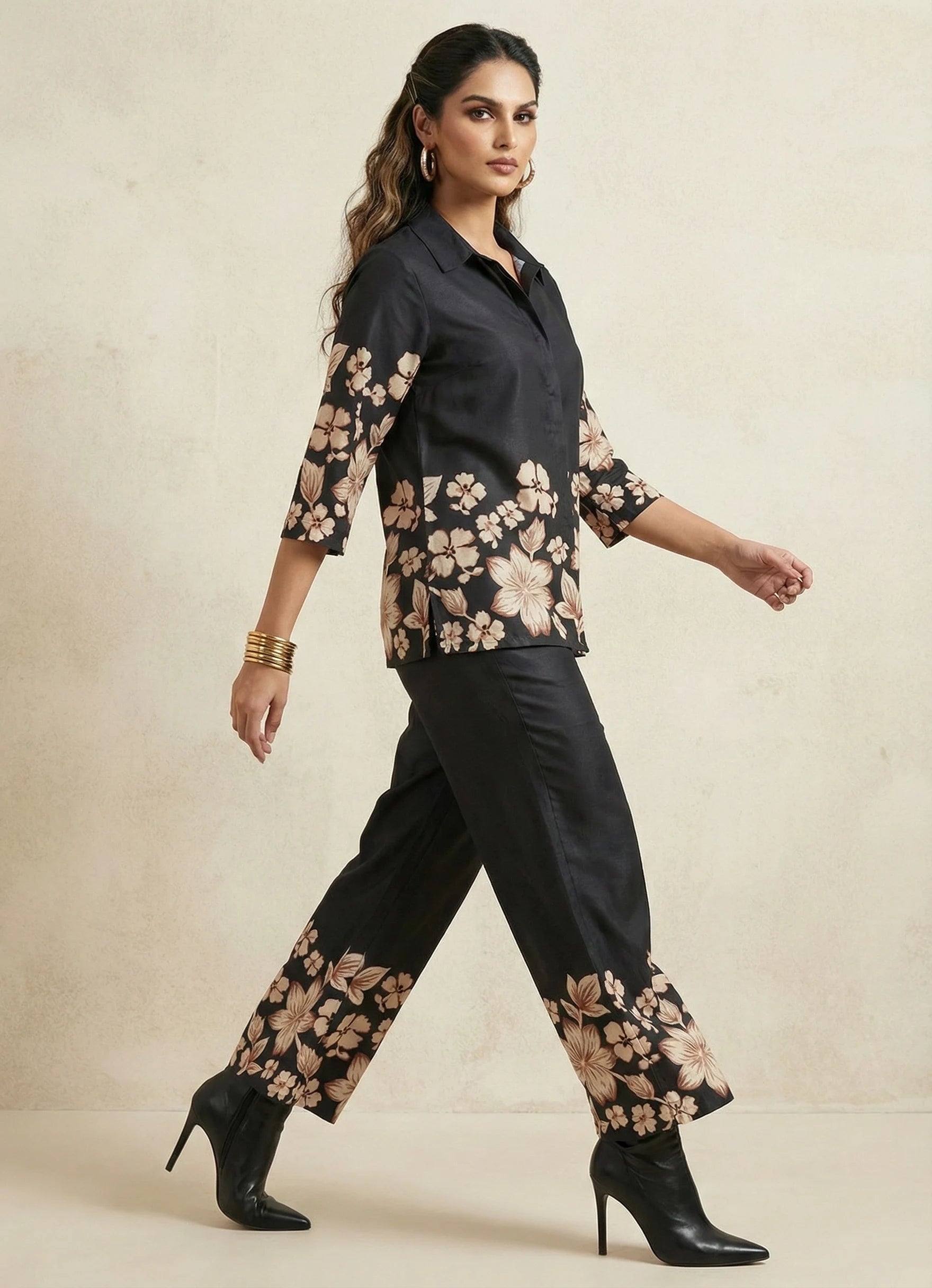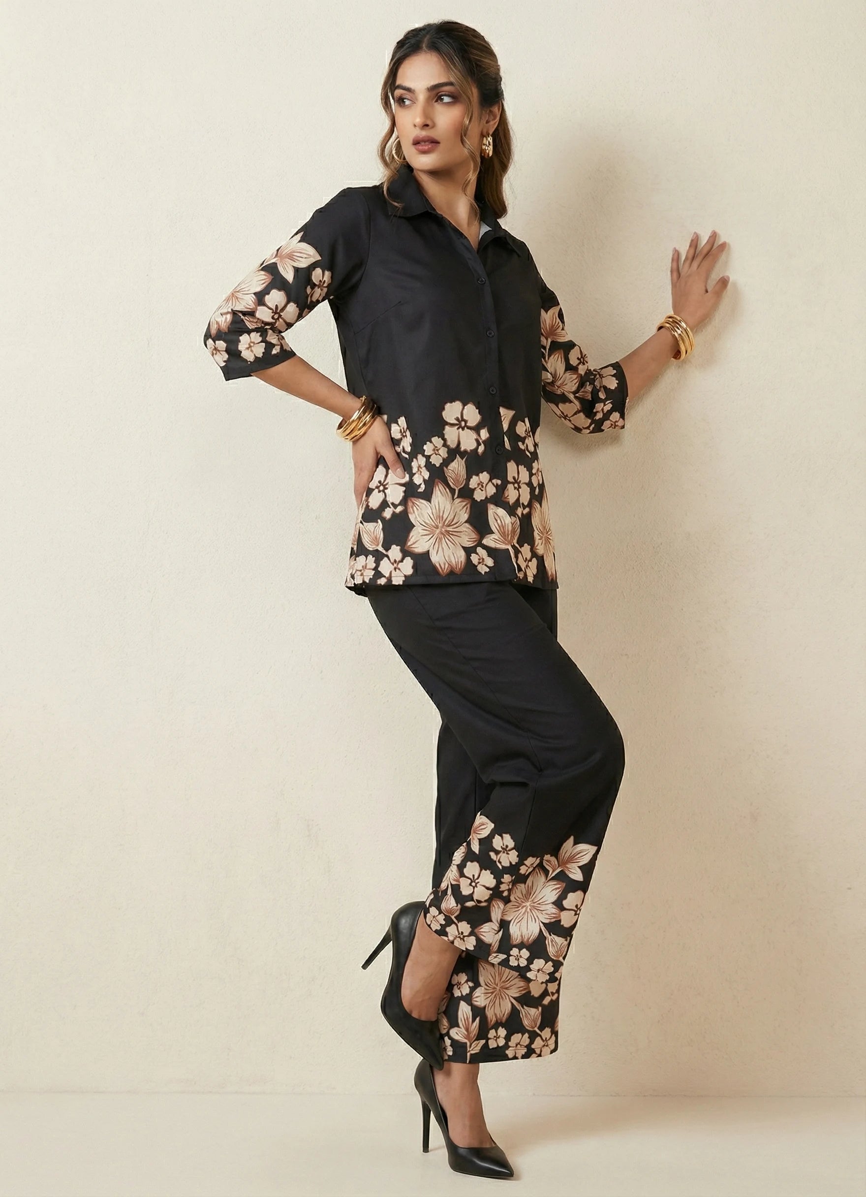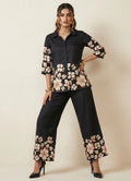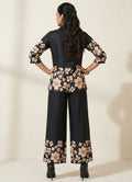 This elegant black short kurti features a flattering V-neck with ¾ sleeves, enhanced by delicate placement floral embroidery and a subtle floral print. Crafted in soft cotton blend fabric, it offers a graceful drape and comfortable feel throughout the day. The kurti is paired with a plain black full-length palazzo pant that perfectly balances the detailed top. Designed with a half belt and half elastic closure, the palazzo ensures a secure yet flexible fit. Ideal for occasional and festive wear, this set combines timeless style with effortless comfort and is suitable for gentle machine wash.