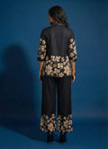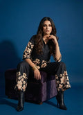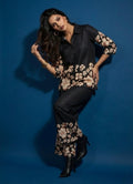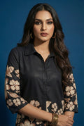 This elegant black short kurti features a flattering V-neck with ¾ sleeves, enhanced by delicate placement floral embroidery and a subtle floral print. Crafted in soft crepe fabric, it offers a graceful drape and comfortable feel throughout the day. The kurti is paired with a plain black full-length palazzo pant that perfectly balances the detailed top. Designed with a half belt and half elastic closure, the palazzo ensures a secure yet flexible fit. Ideal for occasional and festive wear, this set combines timeless style with effortless comfort and is suitable for gentle machine wash.