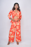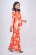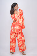 The coordinating full-length bottoms in neon orange also feature the same abstract print, designed with a half-belt, half-elastic waistband for a flattering and comfortable fit. Crafted from cotton blend digital print, this set is perfect for those who want to stand out in style.