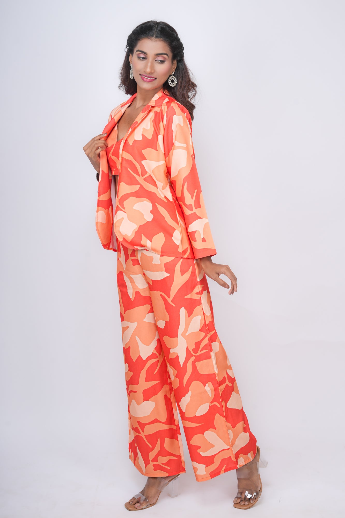 Make a bold statement with this neon orange co-ord set, ideal for both office and occasional wear. The below-knee jacket features full sleeves and a striking abstract print, while the sweetheart neckline of the inner adds a feminine touch.