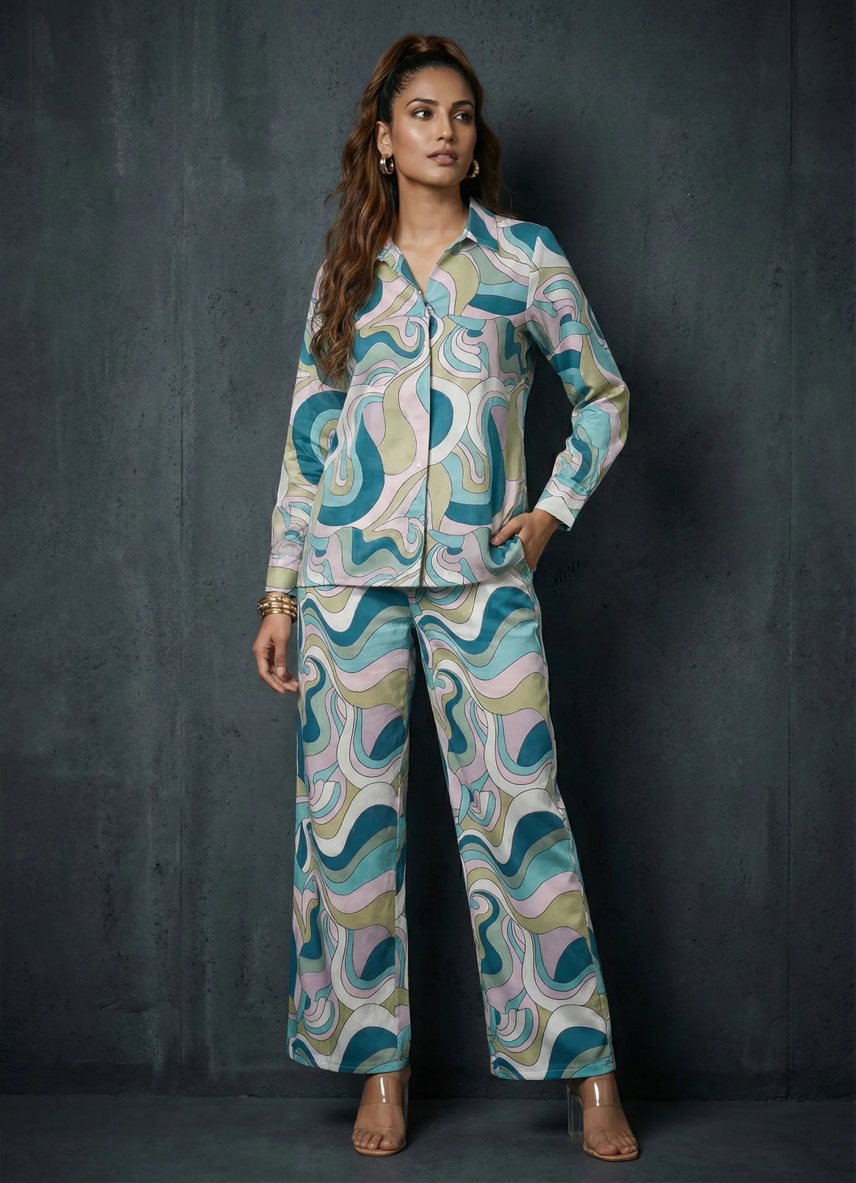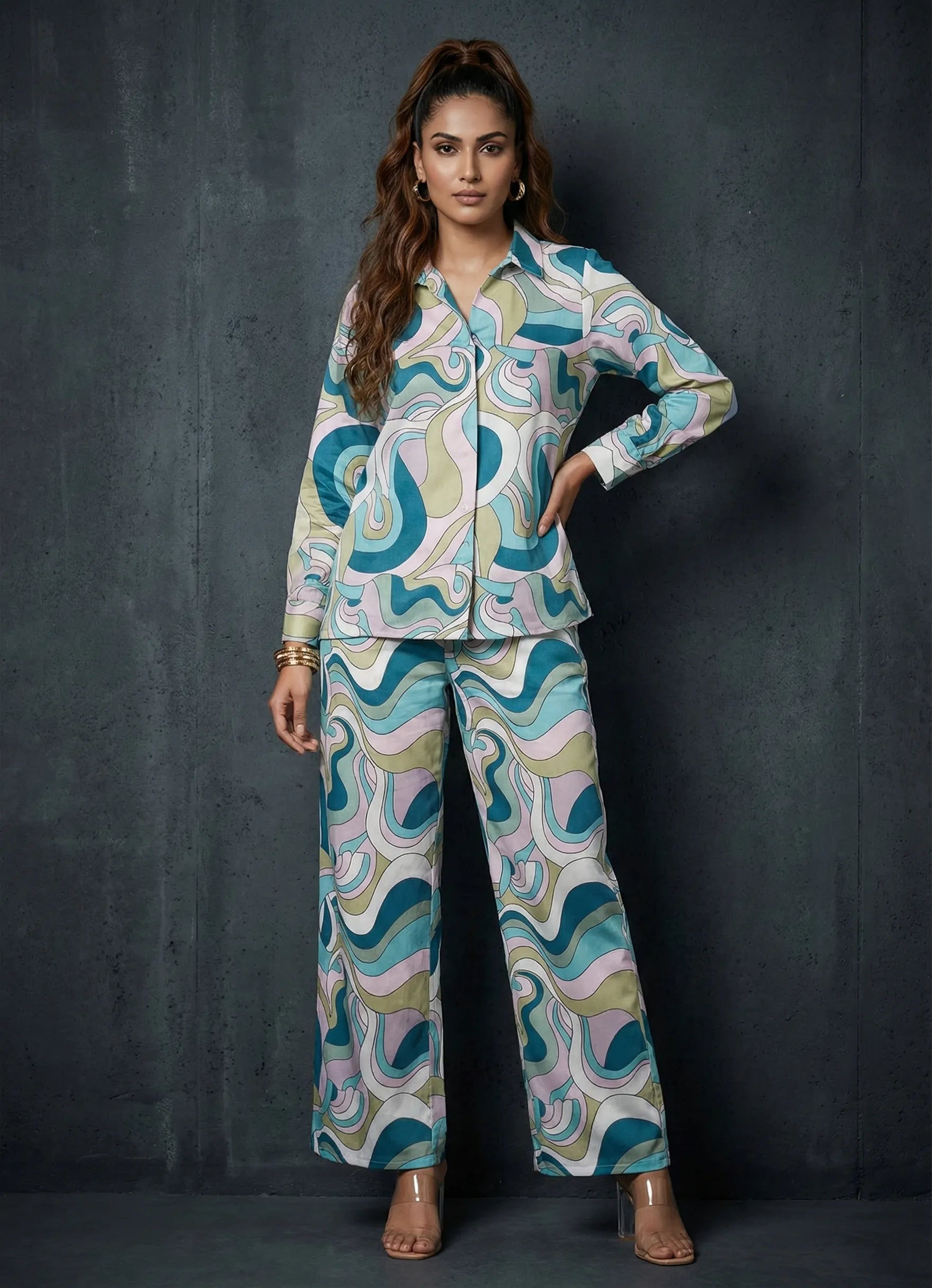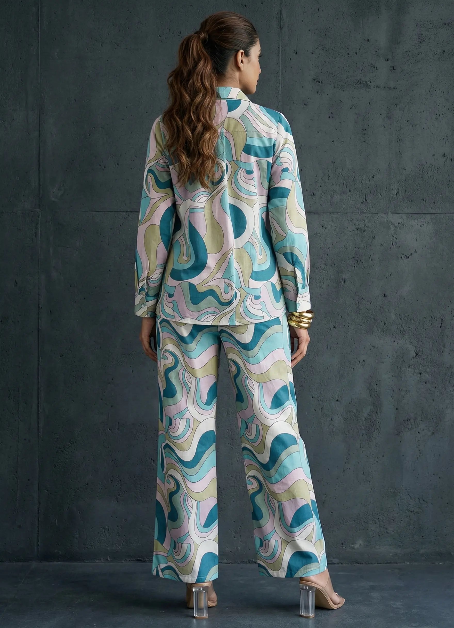 Dive into effortless style with this Ocean Haze Co-ord Set, featuring a waist-length shirt in ocean shade abstract print. Designed with full sleeves, a crisp collar neck, and crafted from breathable Cotton blend fabric, the shirt offers both sophistication and ease. Paired with matching full-length palazzo pants with a half-belt, half-elastic closure, this set is perfect for occasional and regular wear, offering a breezy, coordinated look with a splash of artistic flair.