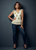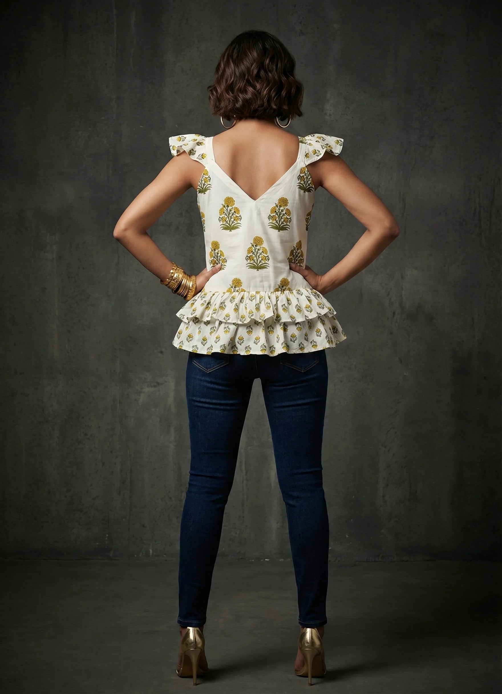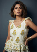A cute minimalistic style is what your wardrobe needs. This floral printed top is fashioned out from off white cotton fabric which consists of V neck in front and back with pleated sleeves and pleats on waist round. It is below waist length top.