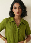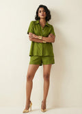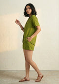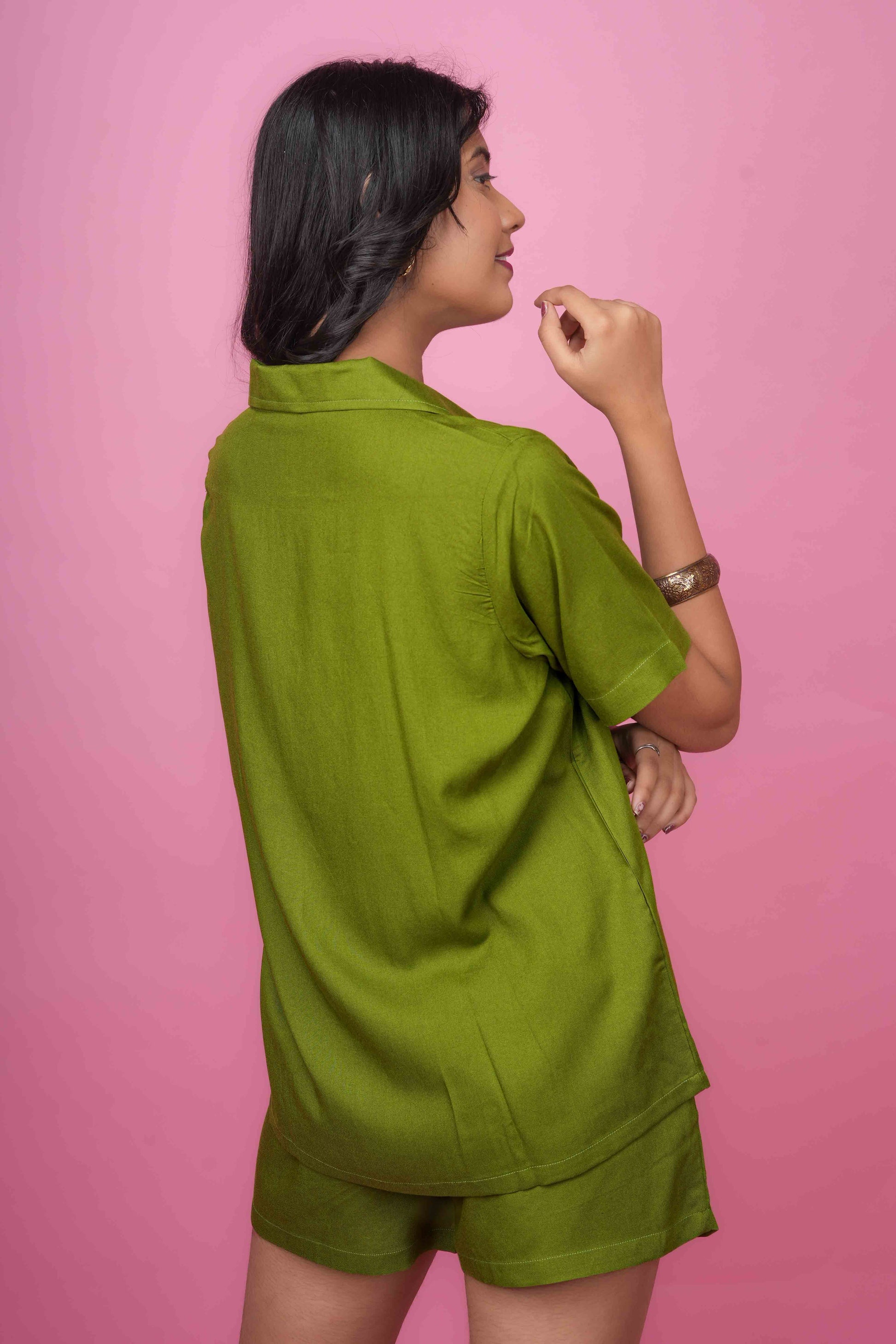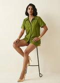 The matching olive green bottoms sit just above the knee, designed with a half-belt, half-elastic waistband for a flattering and flexible fit. This set offers a chic and relaxed look that works for any occasion.