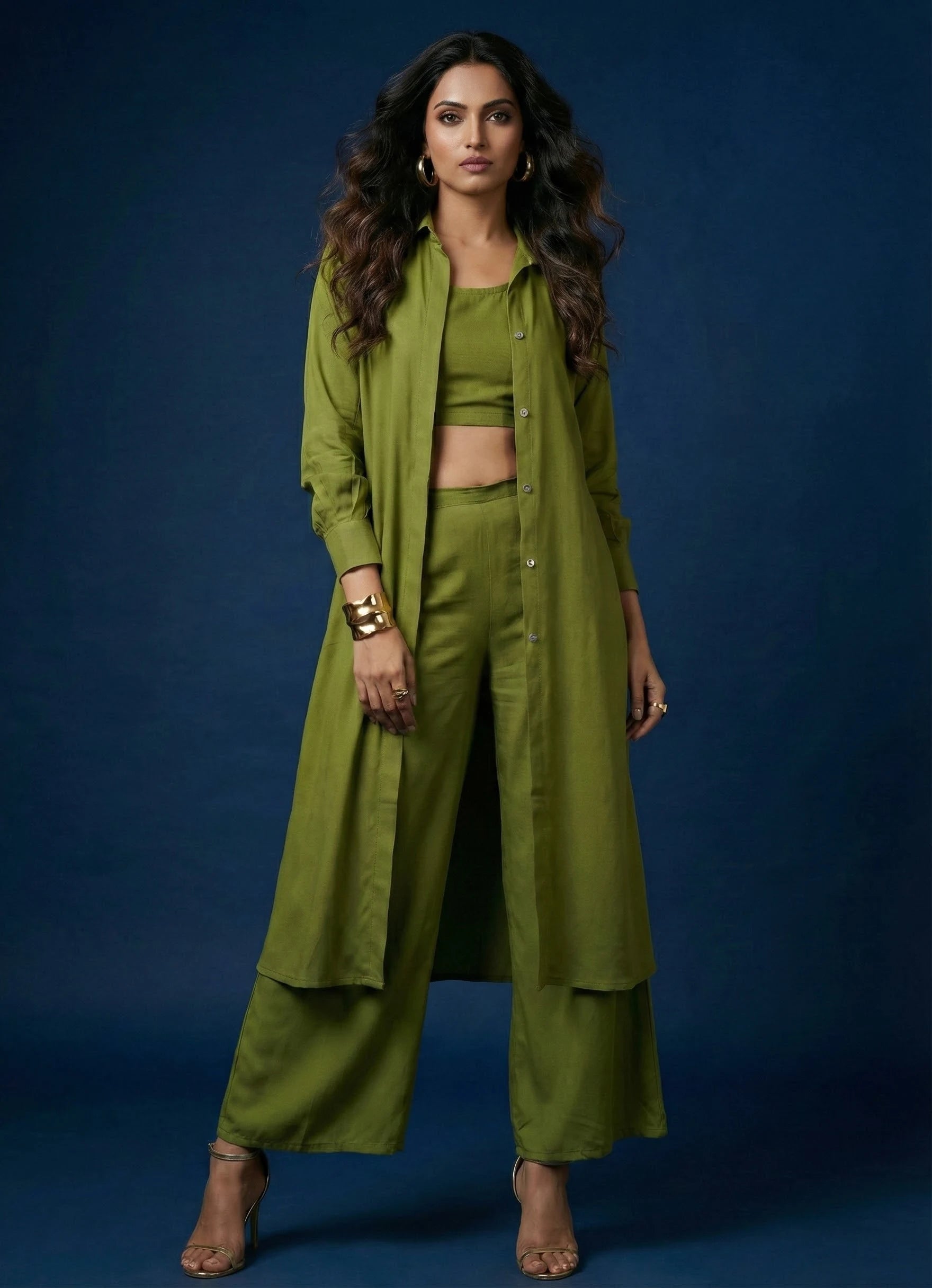 Elevate your wardrobe with this sophisticated olive green three-piece co-ord set, perfect for both occasional and regular wear. The ensemble features a hip-length long shirt top with a classic collar neck and full sleeves, offering a sleek and modest silhouette. The plain Cotton blend fabric enhances its refined appeal, while a matching round neck inner in a similar olive green shade adds comfort and depth. Complementing the top is a pair of full-length palazzo pants in the same hue, designed with a half belt and half elastic waistband for effortless wearability. This no-print set delivers a timeless and elegant look with modern ease.