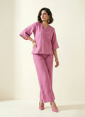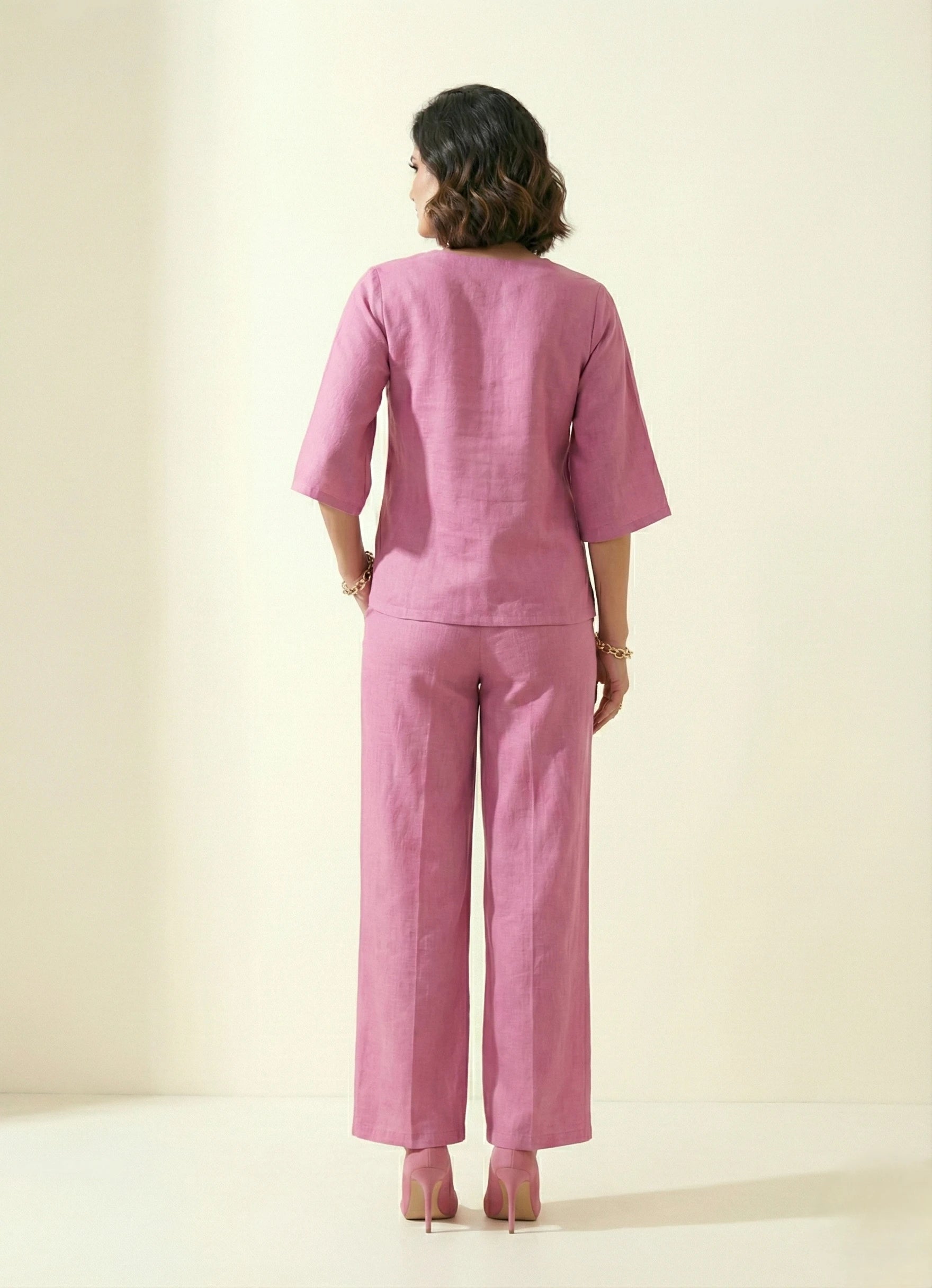 Refined and effortlessly chic, this Opera Mauve co-ord set is perfect for both regular and occasional outings. The waist-length top features a flattering V-neckline and elbow-length sleeves, tailored in soft Cotton blend fabric that ensures all-day comfort. With its solid, no-print design, the set exudes understated elegance. The matching full-length palazzo pants come with a half belt and half elastic waistband for a comfortable yet structured fit. This minimalist ensemble is versatile enough for casual daywear or a dressed-up evening look.