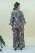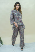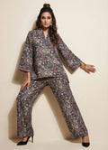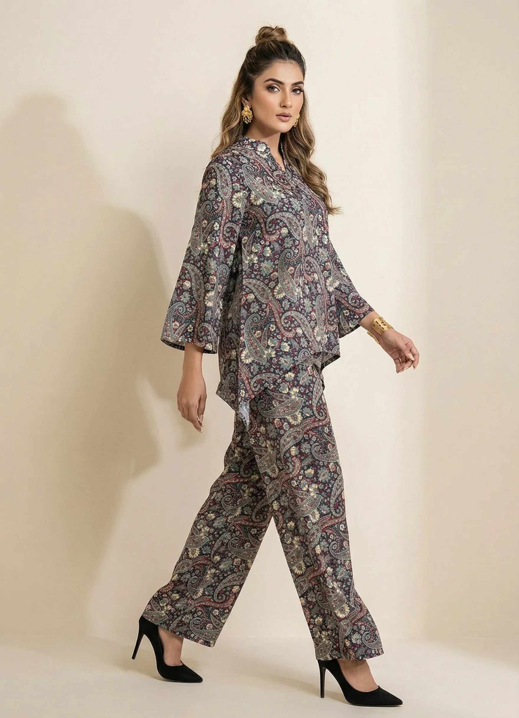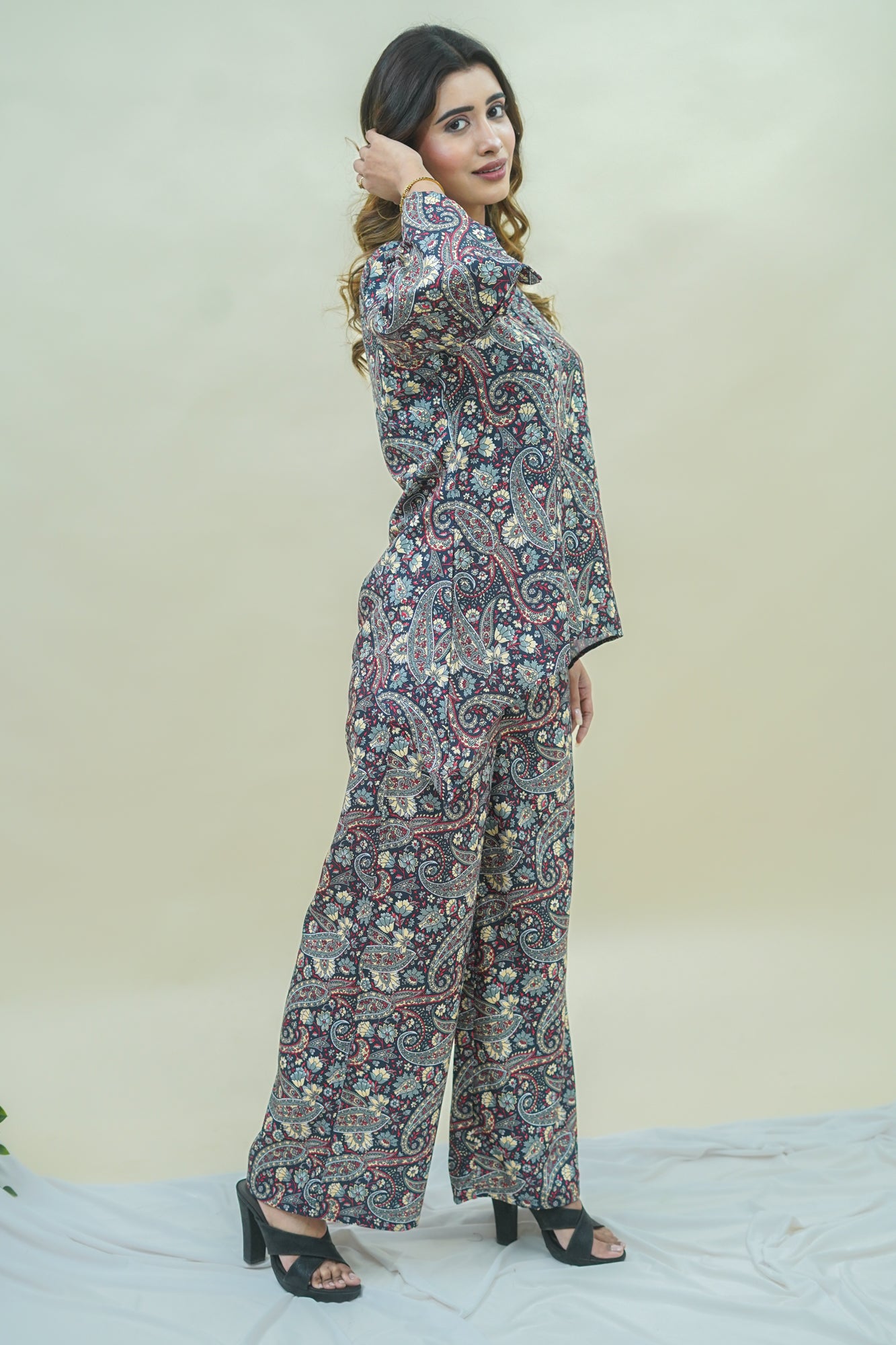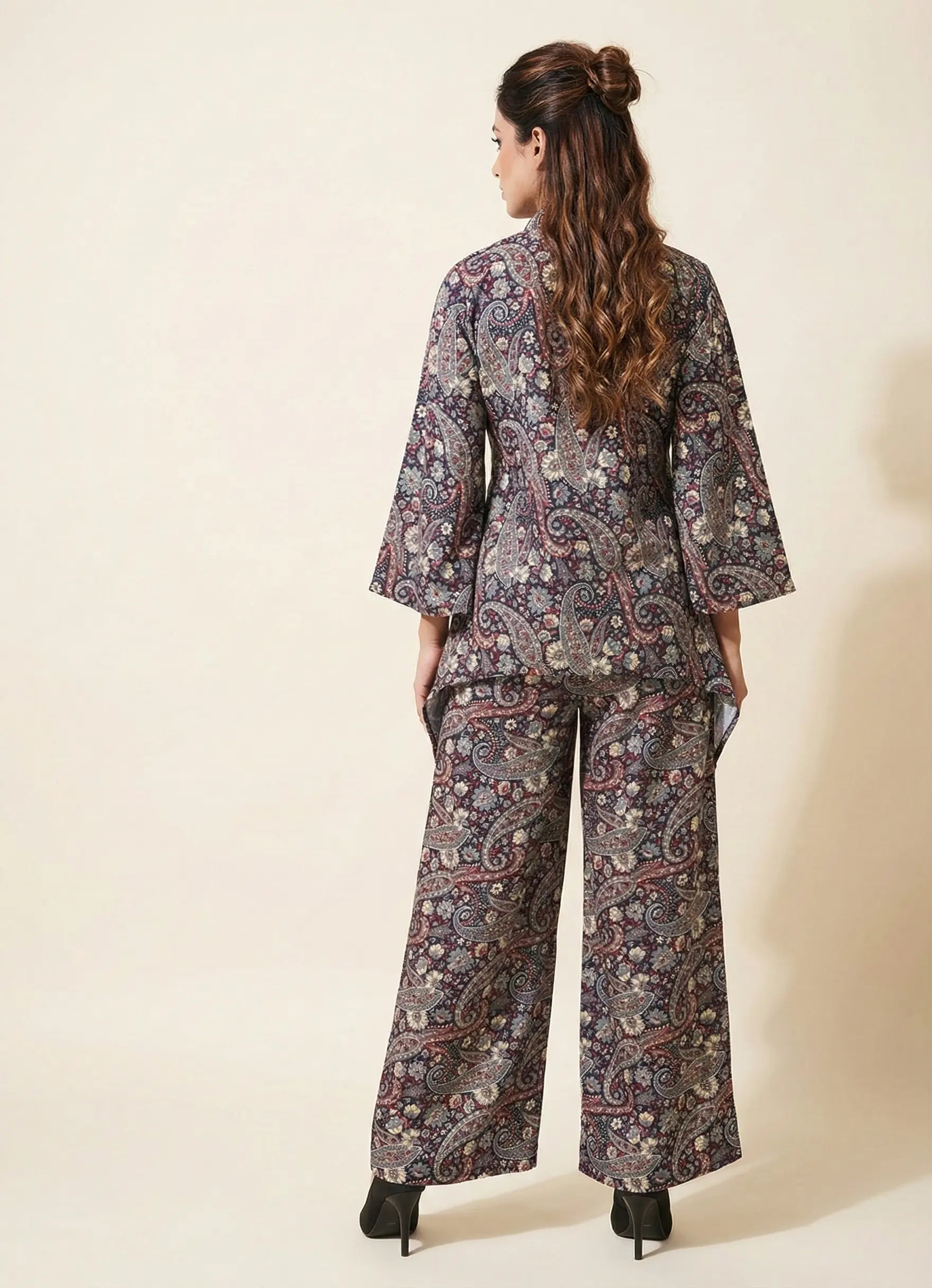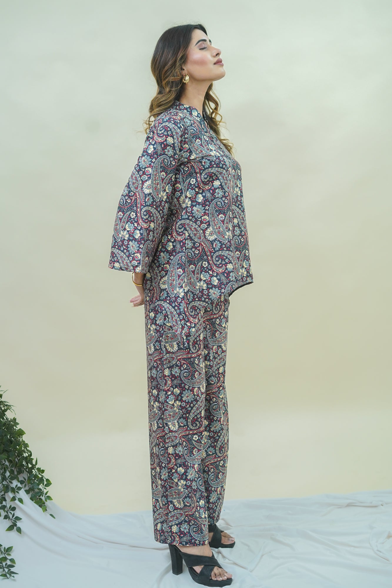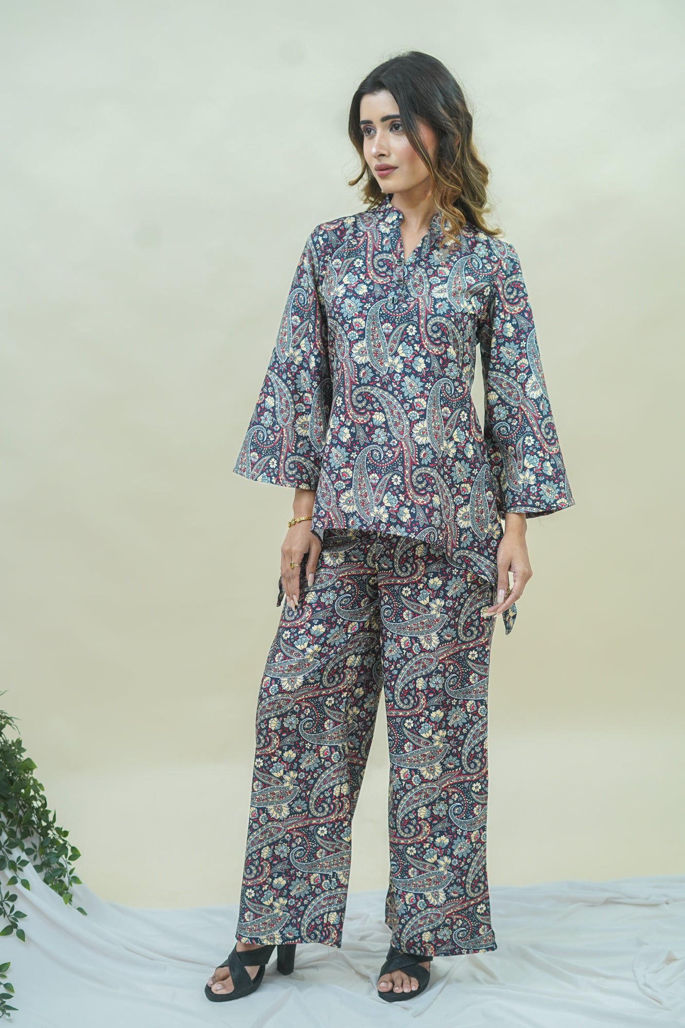 The pointed top features a classic collar neck, elegant long bell sleeves, and a stunning floral paisley print. Made from soft Cotton Blend digital print fabric, it's perfect for adding a touch of sophistication to your everyday look. The matching bottom has a comfortable full-length design with a half belt and half elastic closure, providing a flattering fit.