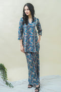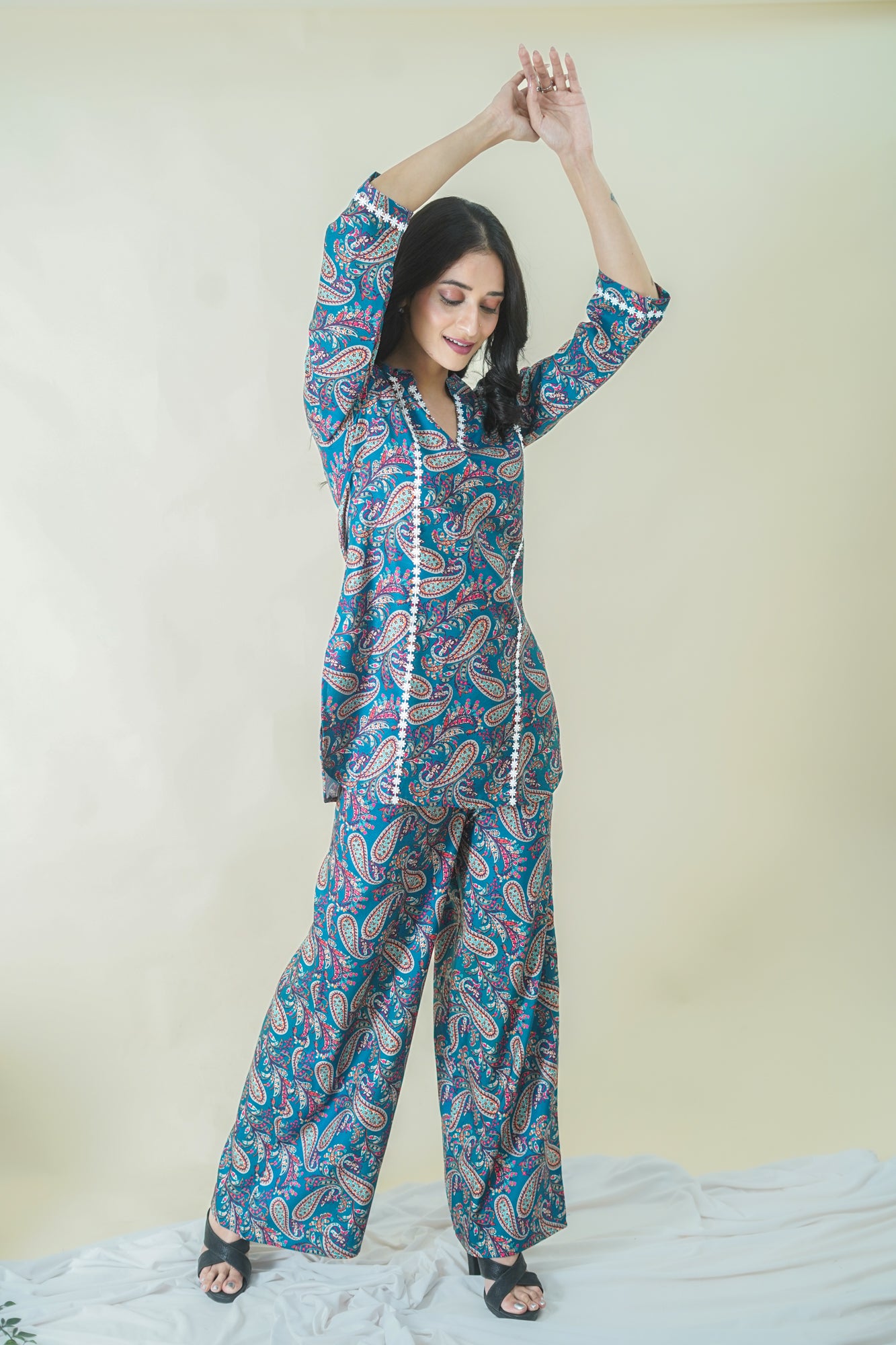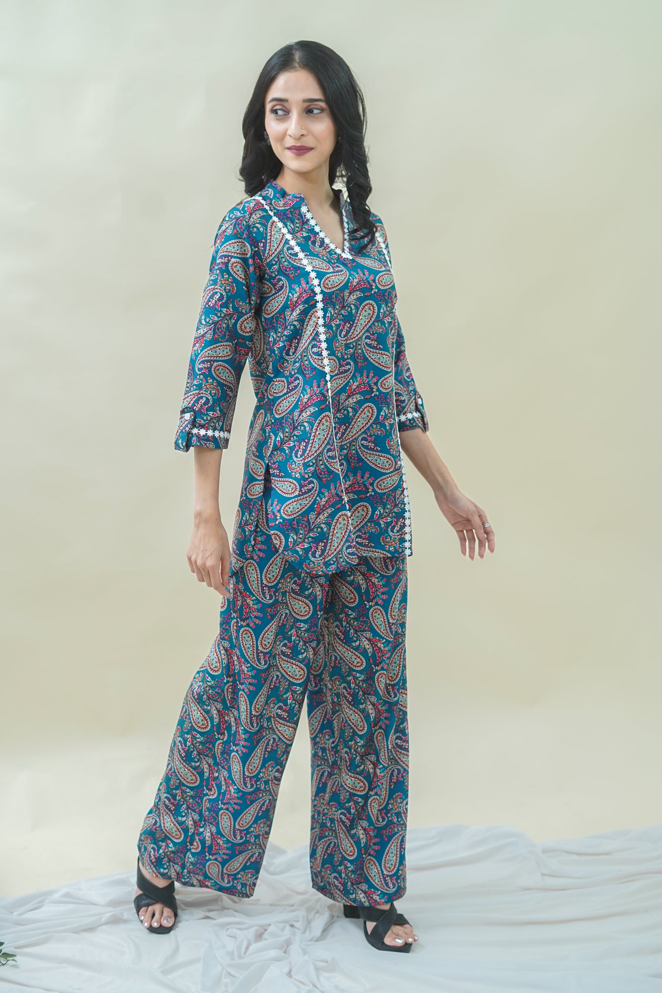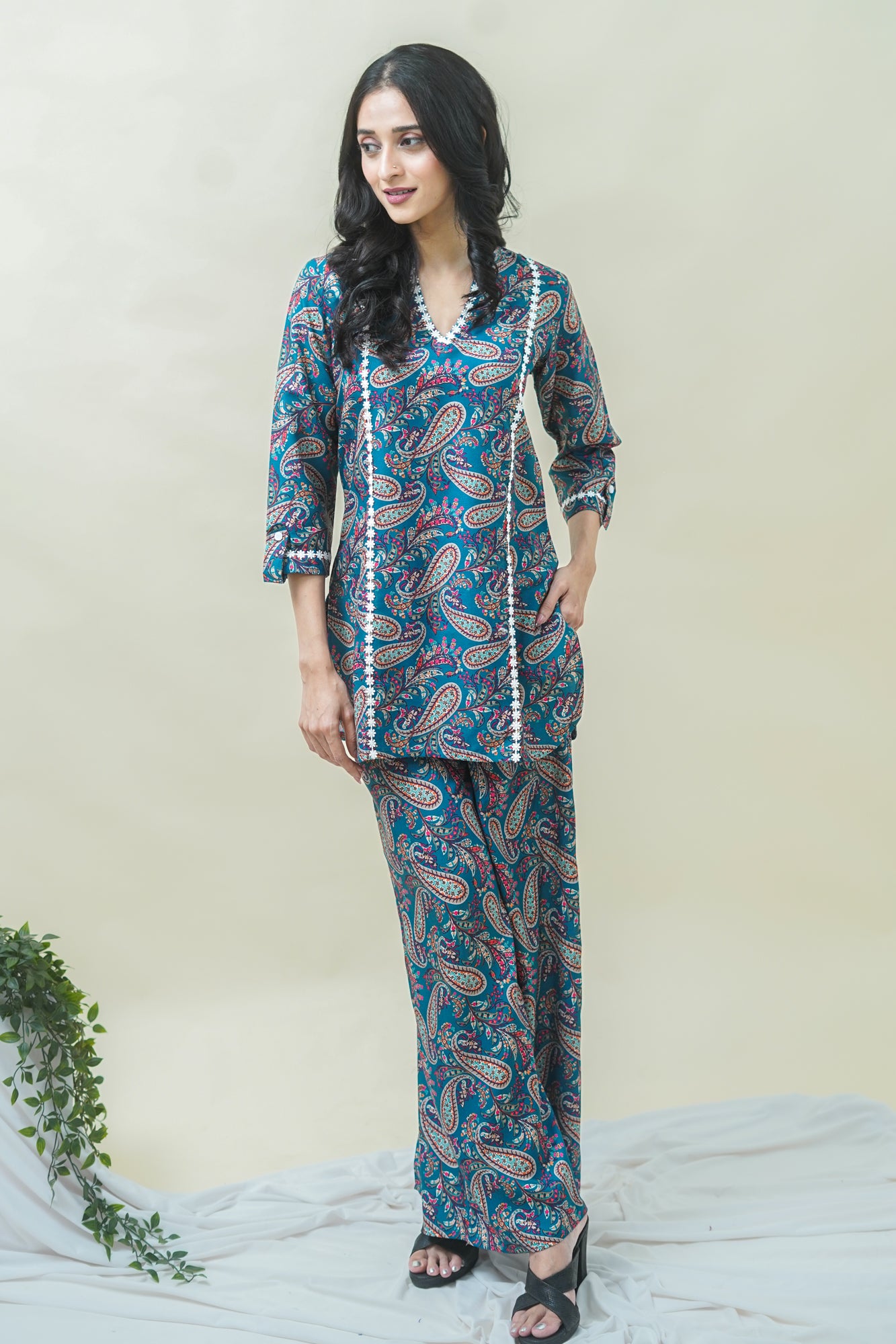 Make a statement with this gorgeous teal blue kurti and pant set! The ¾ sleeved kurti features a flattering V-neck, plain sleeves, and a beautiful paisley print that adds a touch of sophistication. The matching pant has a comfortable full-length design with a half belt and half elastic closure, providing a flattering fit. Made from soft cotton blend digital print fabric, this set is perfect for dressing up or down and is suitable for both occasional and regular wear. Pair it with your favorite accessories for a stylish and elegant look!