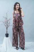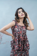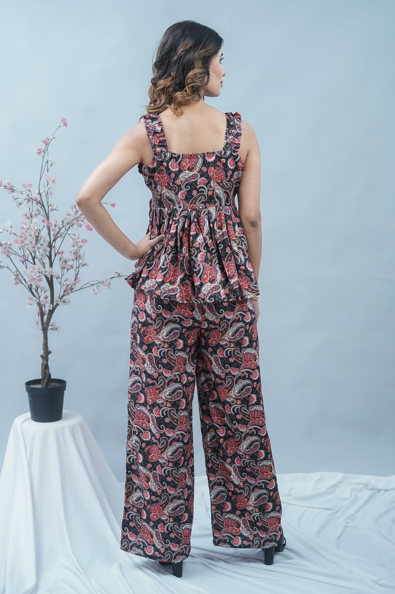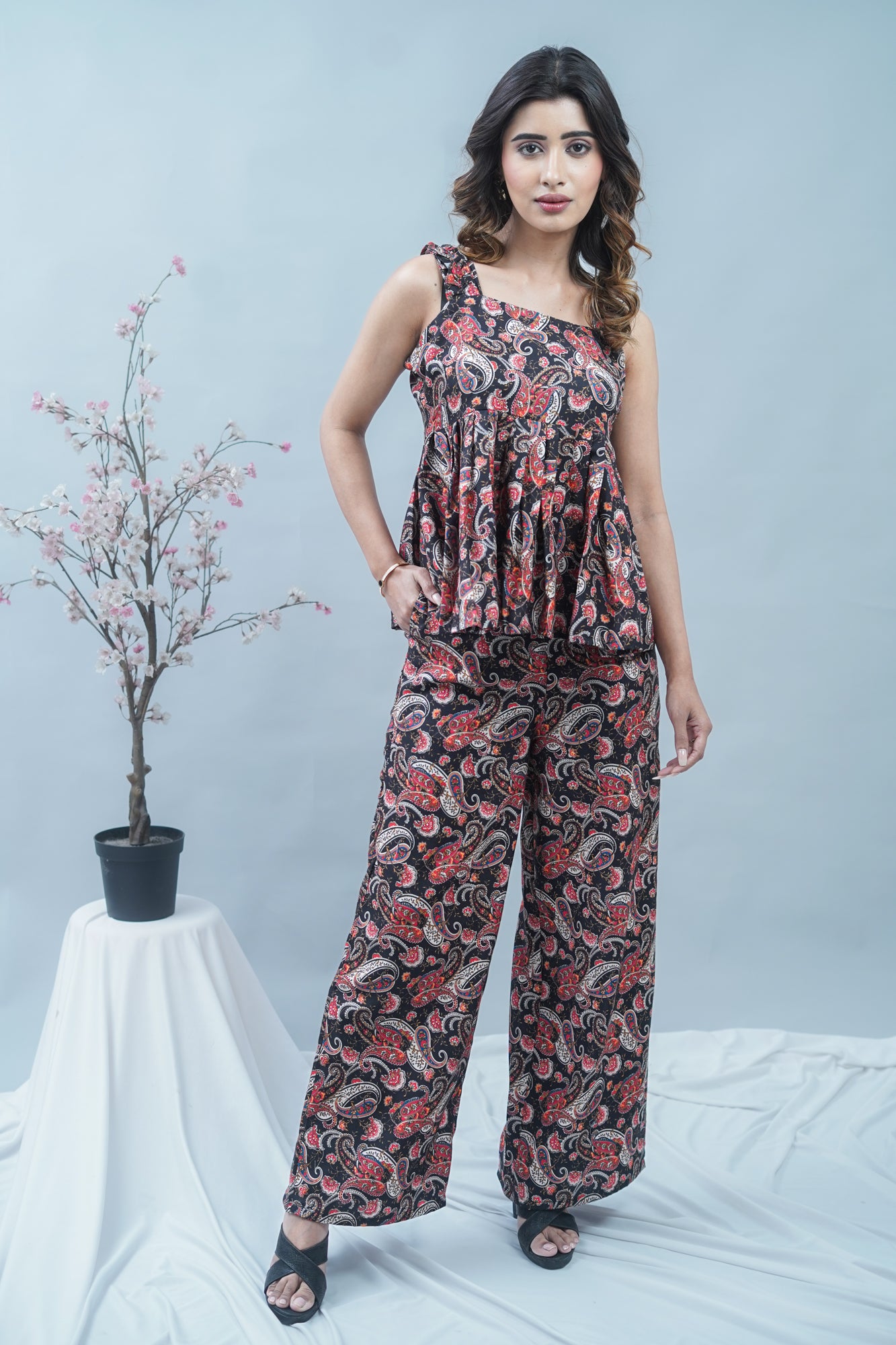 This stylish cord set is perfect for casual office wear, combining comfort and sophistication. The black fabric is adorned with a subtle paisley print, adding a touch of classic pattern to an otherwise sleek design.