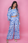 This white paisley print co-ord set is the perfect choice for both occasional and regular wear. The crop top features long bell sleeves and a classic round neck, beautifully adorned with an intricate paisley print that adds a touch of bohemian elegance.