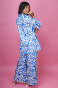 The coordinating paisley print bottoms in white are designed with a half-belt, half-elastic waistband, providing a comfortable and flattering fit that extends to full length. Crafted from cotton blend digital print, this set combines style and comfort seamlessly.
