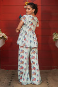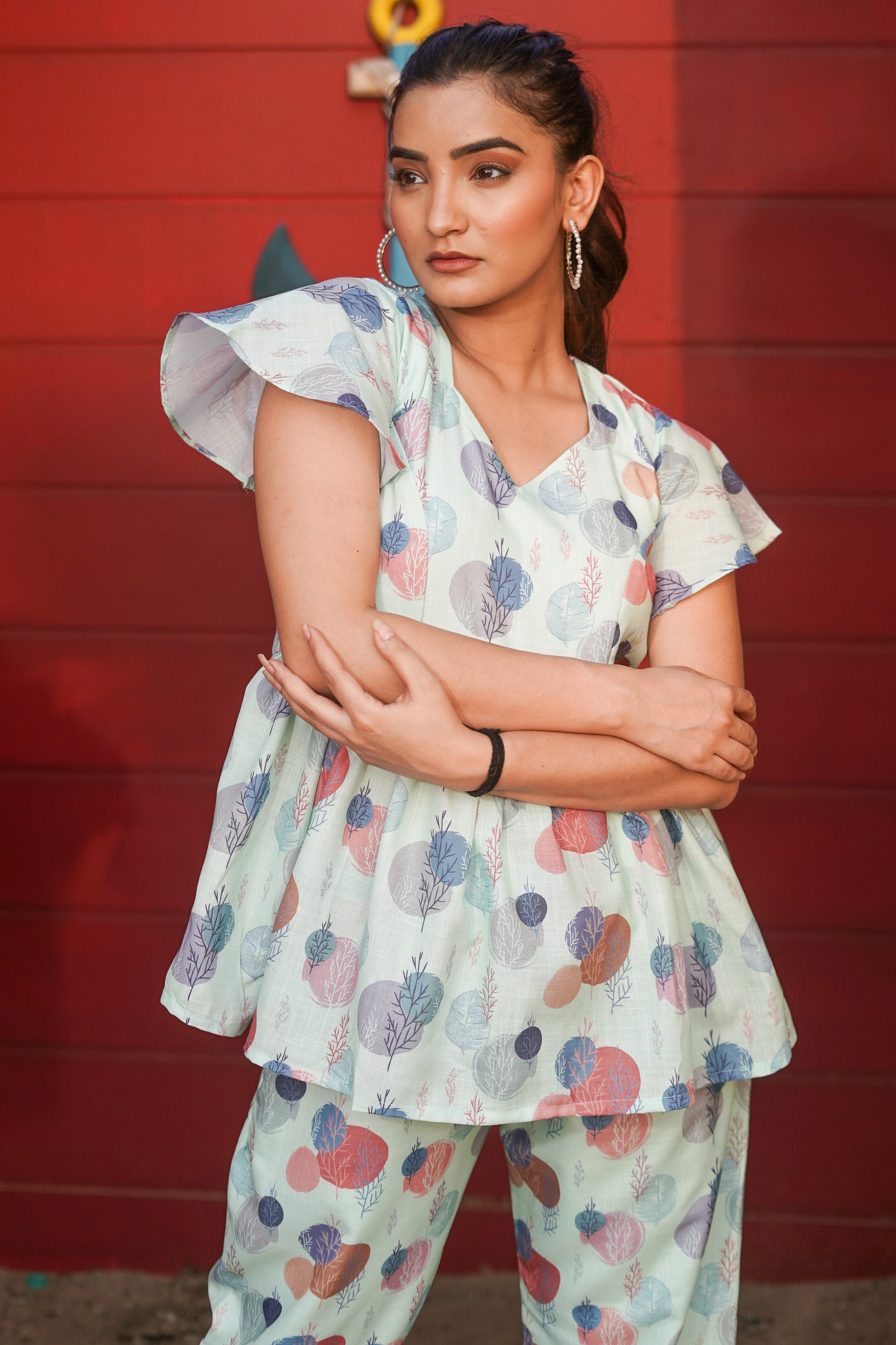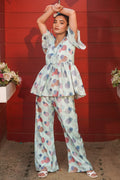 The Paradise Green co-ord set is a stunning and coordinated outfit designed to make a statement. This co-ord set crafted out from floral printed Cotton Blend fabric has diamond neckline, flared short sleeves and gathers around the waist paired up with flared pants.