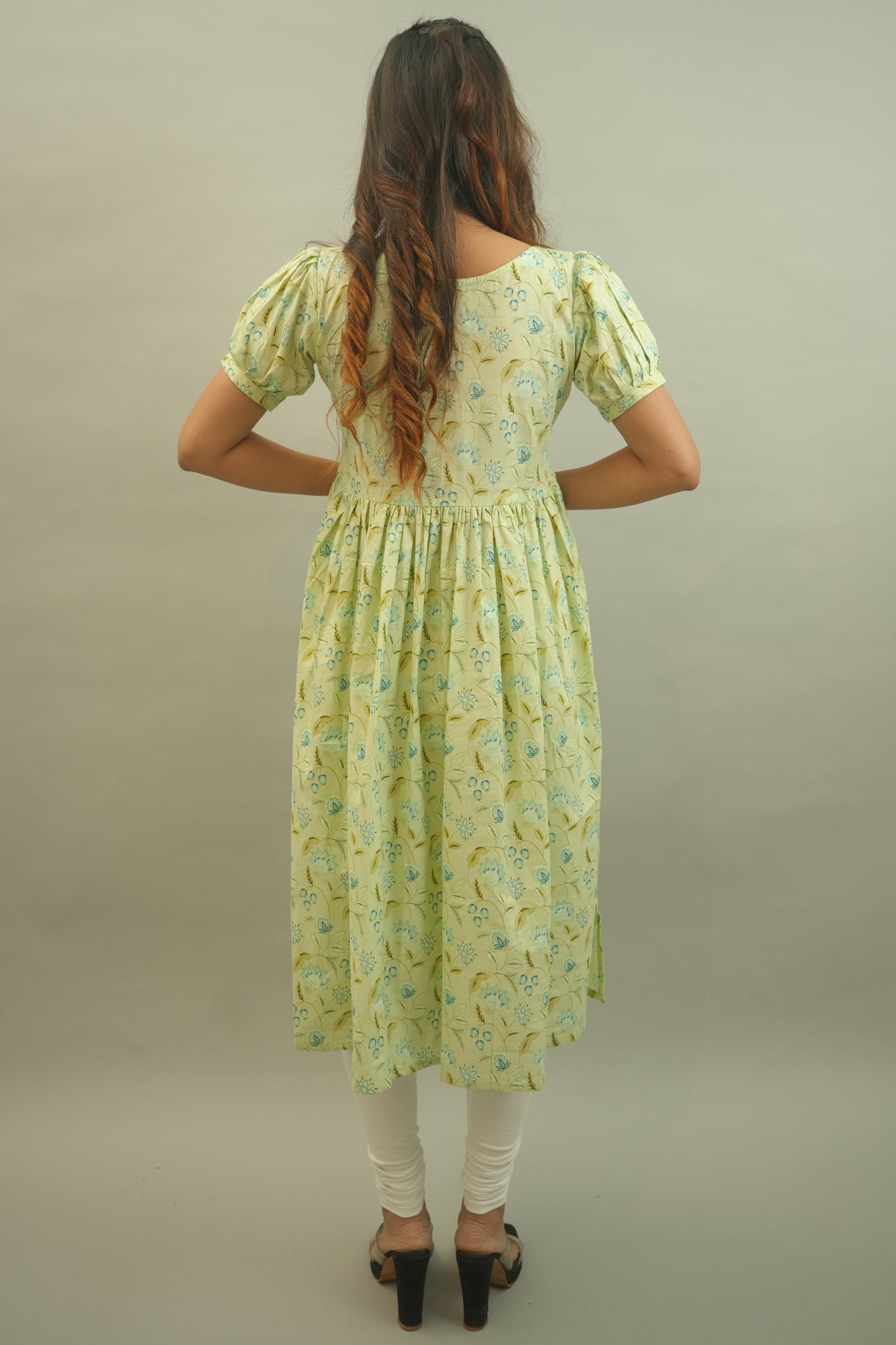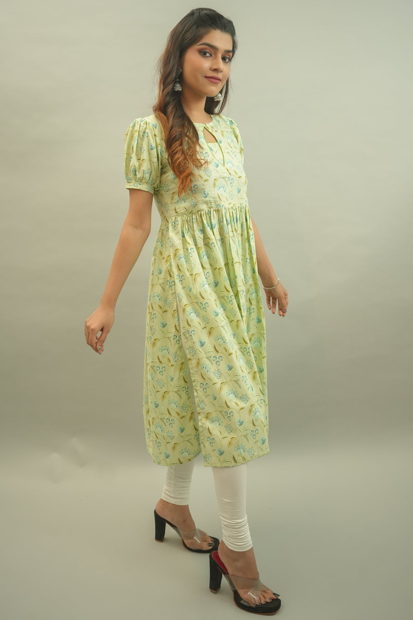 Description: A simple regular kurta with some small detailing can give you an elegant look. This kurta fashioned out from Pastel green floral printed fabric has detailing of a keyhole neckline with patch work and piping, gathers on waist round and puffed sleeves. It is a regular straight kurta with both side slit, flared cut and short sleeves.
