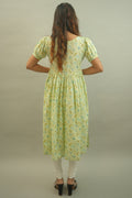 Styling: Green piping and patch work on the neckline, gathers round the waist