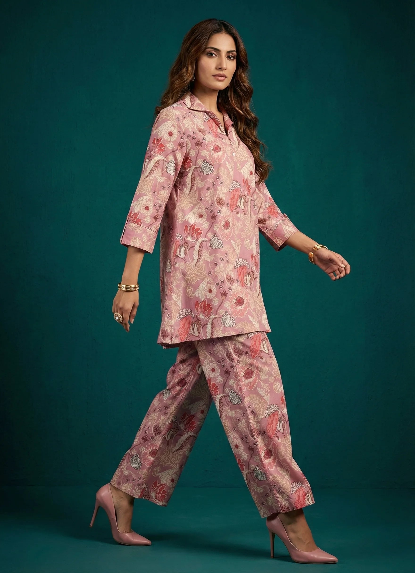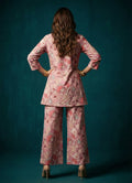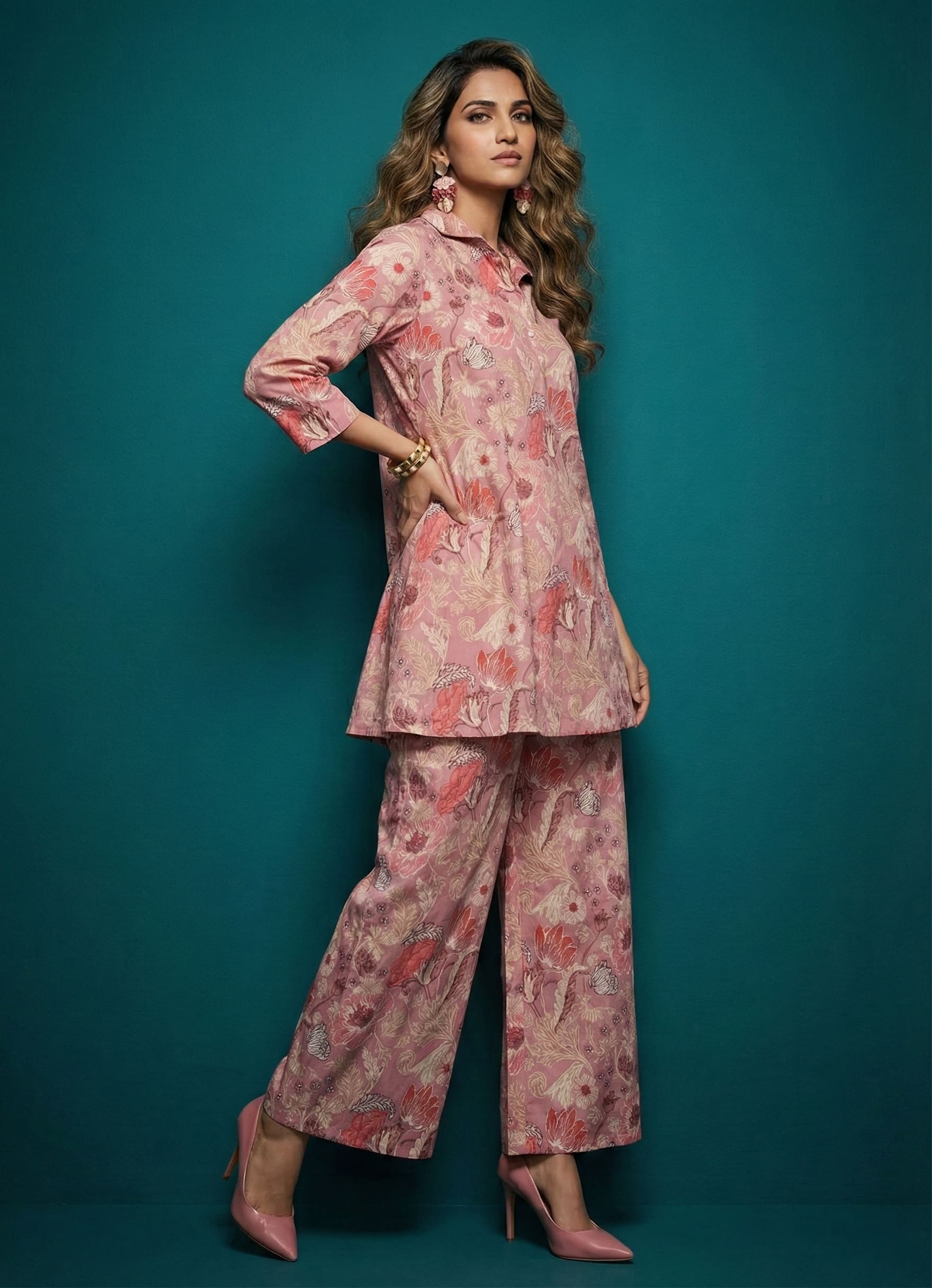 This soft pastel salmon kurti set features a stylish V-collar neck with graceful ¾ sleeves.